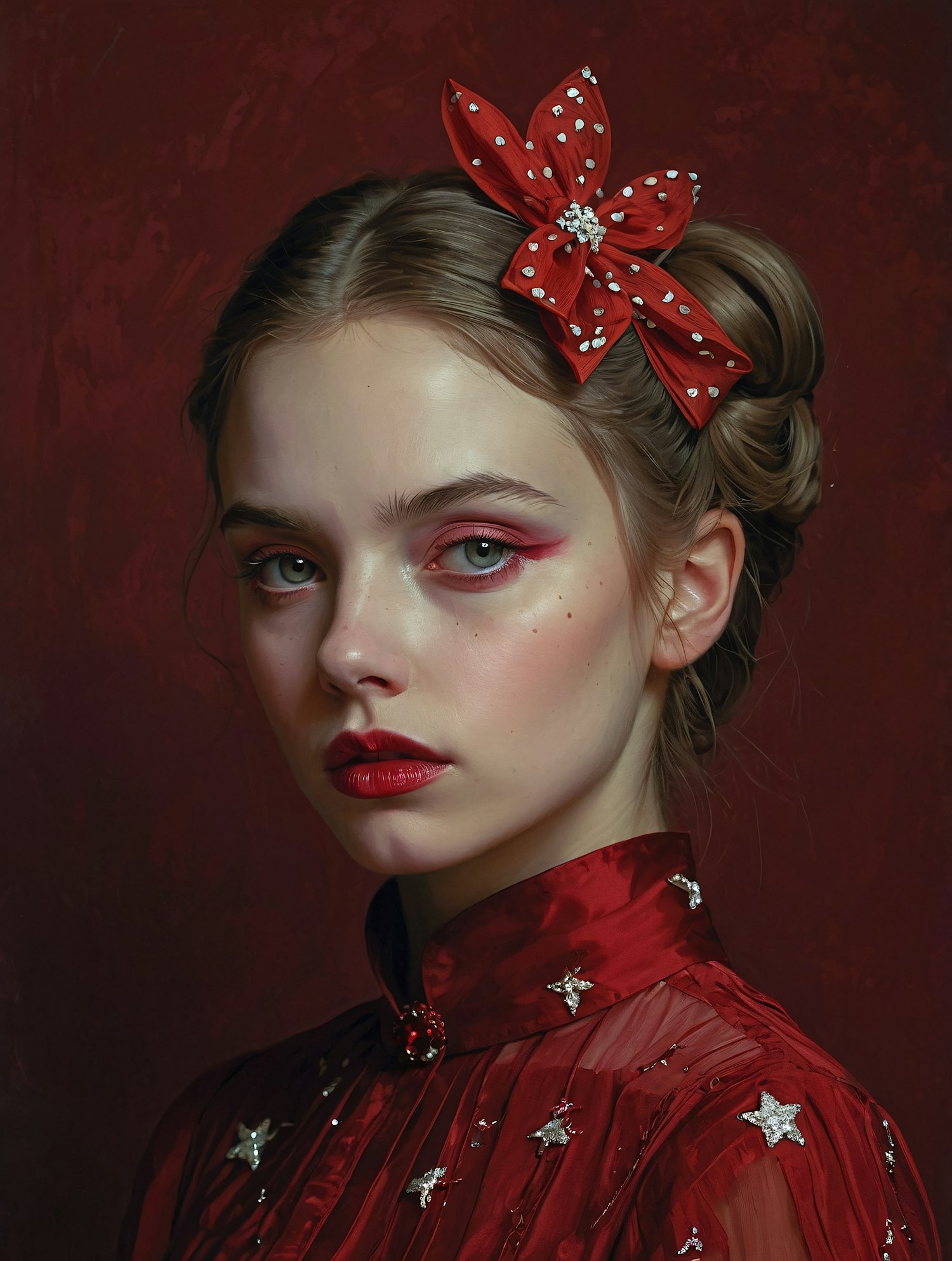 Elegant portrait of a young woman in red with striking makeup and a decorative bow, set against a rich red background.