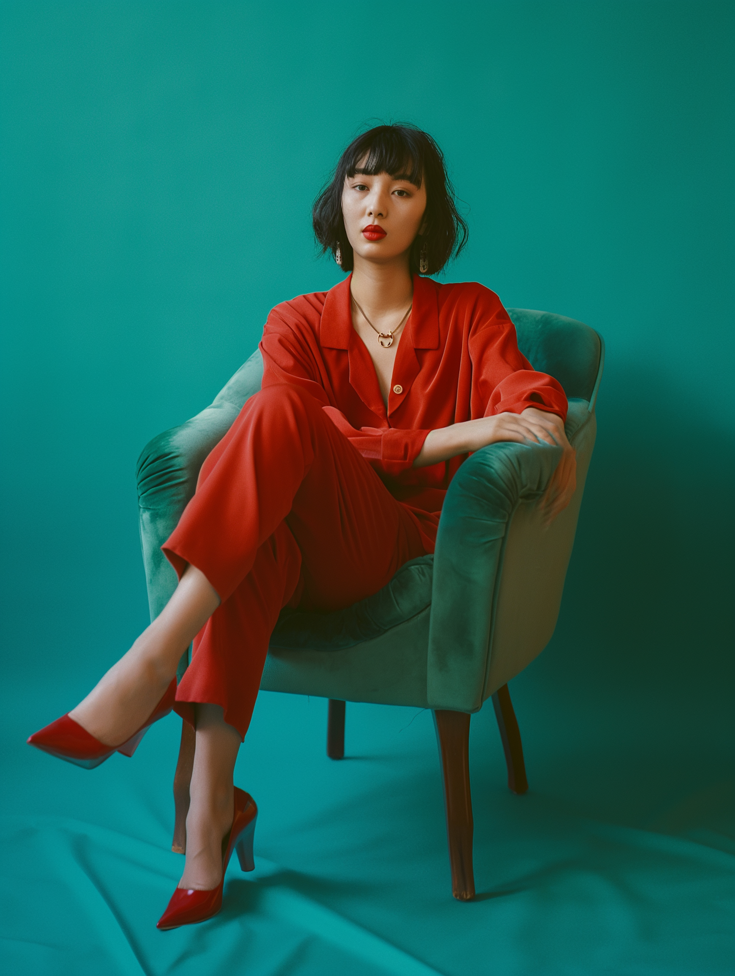 Stylish Asian woman in red outfit sitting in a green armchair against a teal background, exuding confidence and elegance.