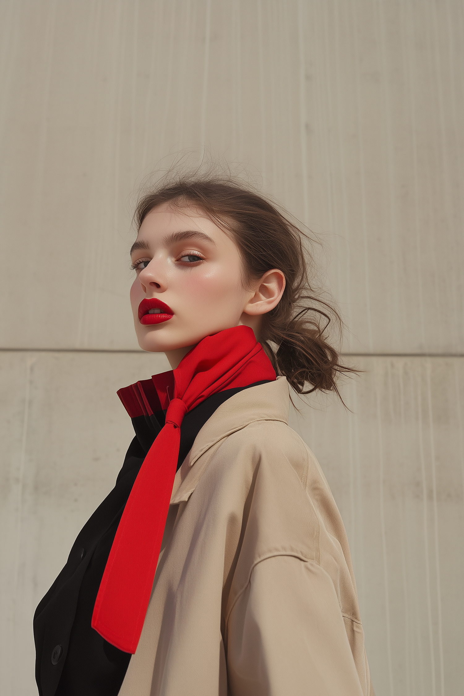 Elegant woman in beige trench coat and red scarf, bold red lipstick, and confident pose against a minimalist light wall.