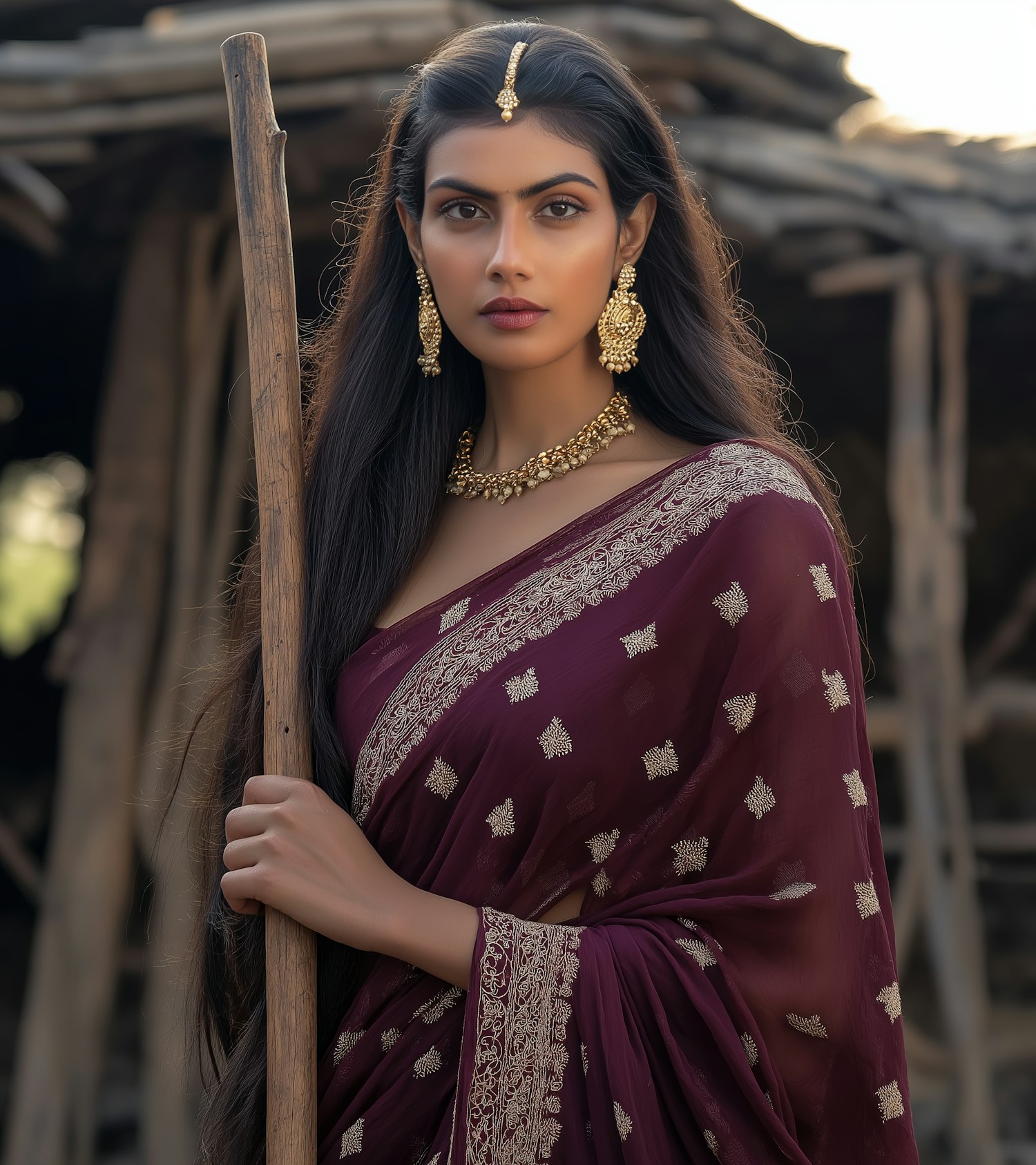 A woman in a maroon saree with gold embroidery, adorned with traditional jewelry, stands in a rustic setting holding a wooden staff.