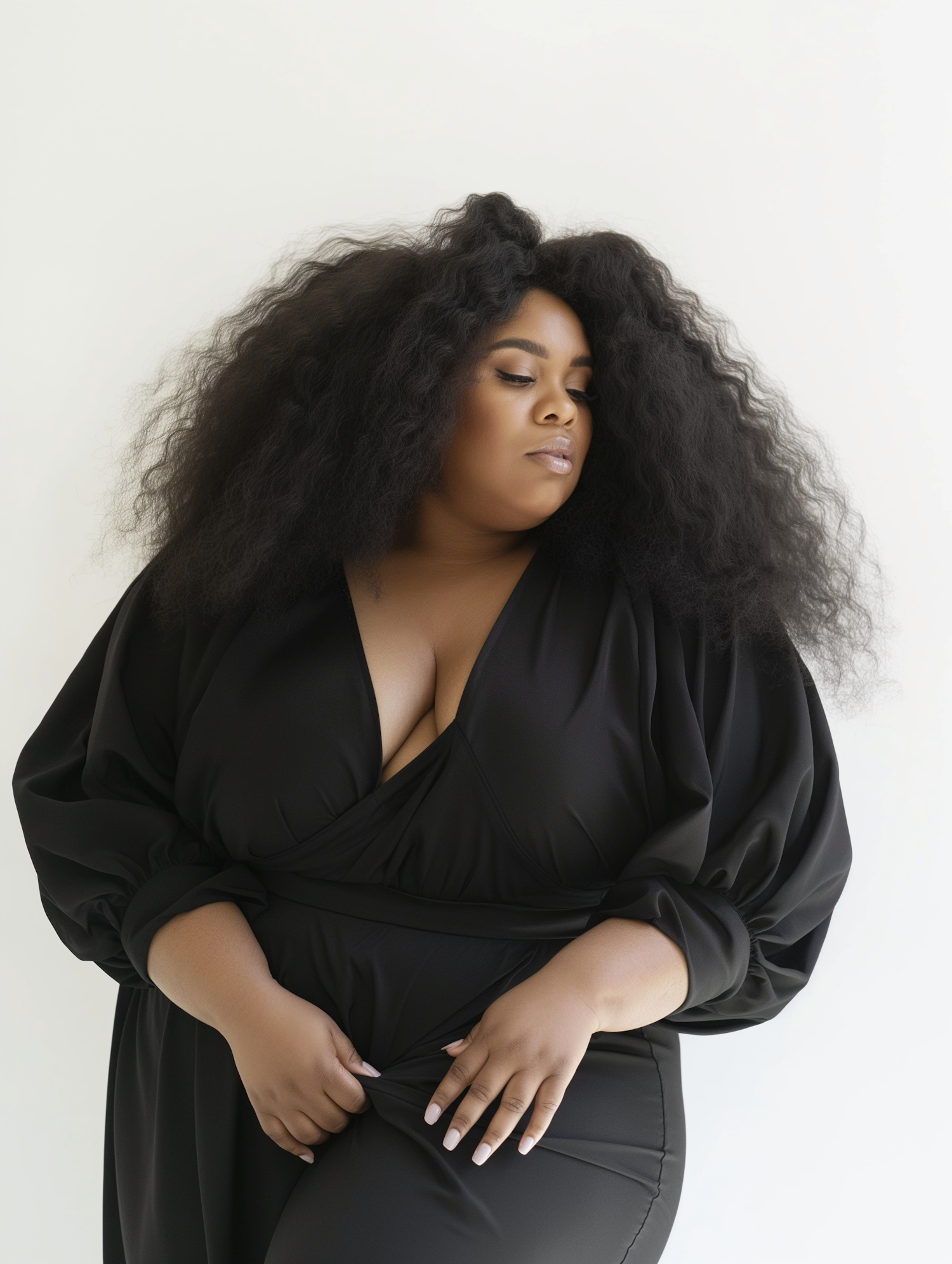 Elegant Black woman in a black dress with voluminous curly hair, serene expression, and graceful pose against a white background.