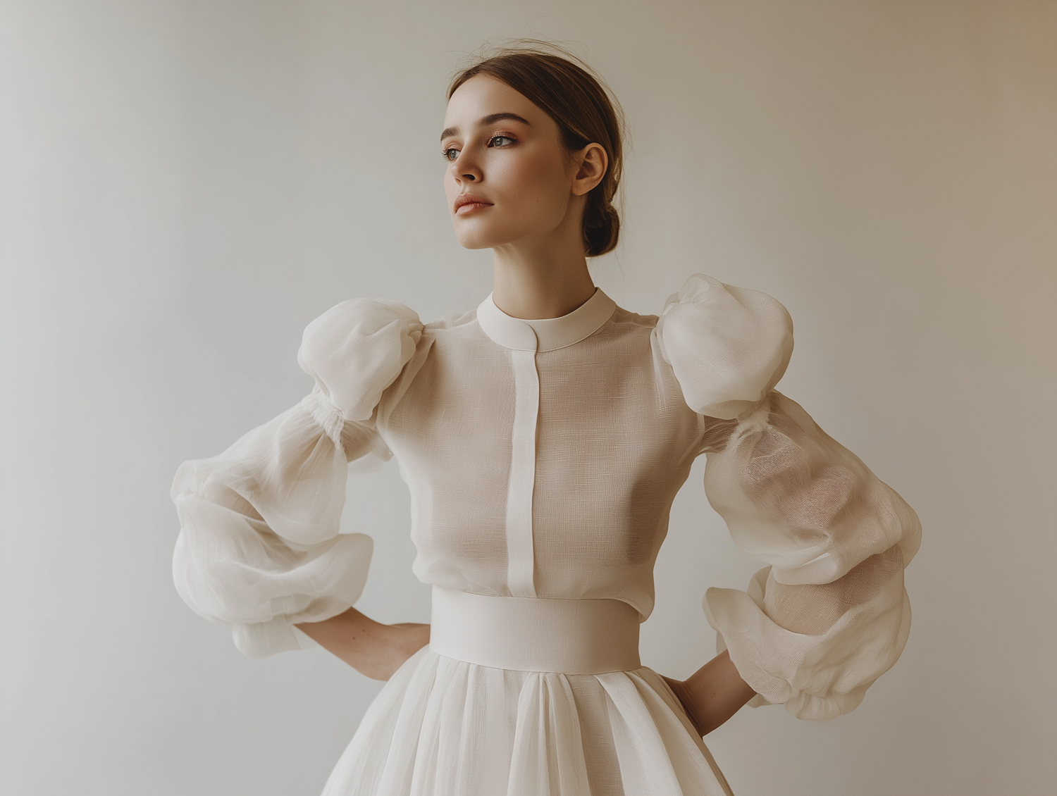 Elegant woman in sheer white blouse with puff sleeves and flowing skirt, exuding grace and timeless fashion.