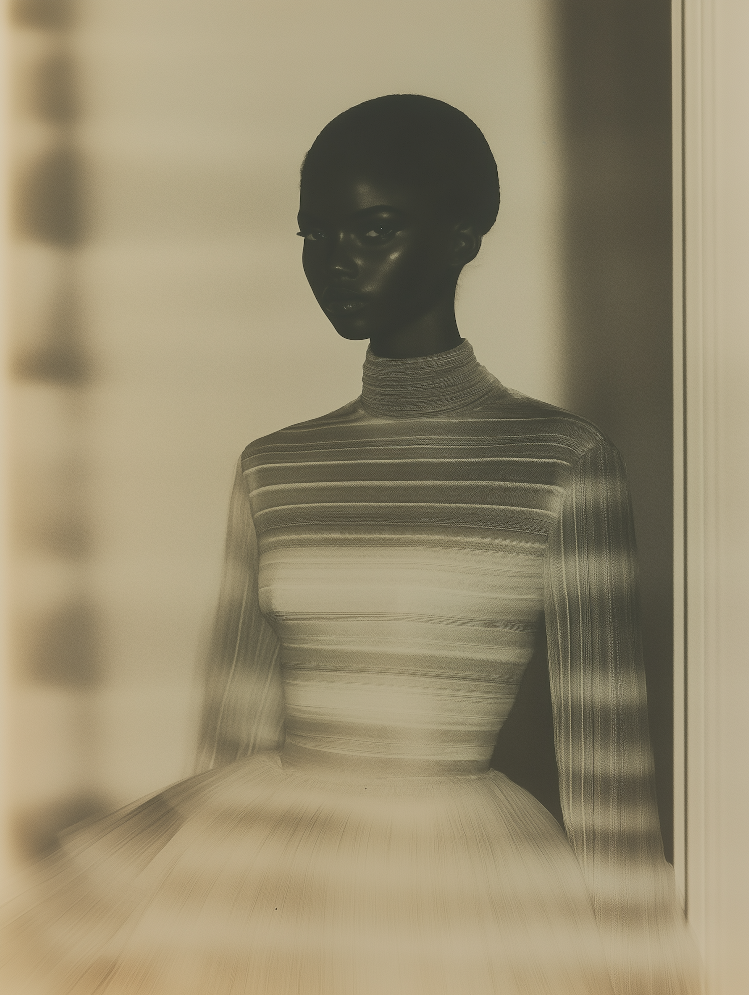 Elegant portrait of a woman in a striped dress with a blurred effect, creating a sense of motion and drama.