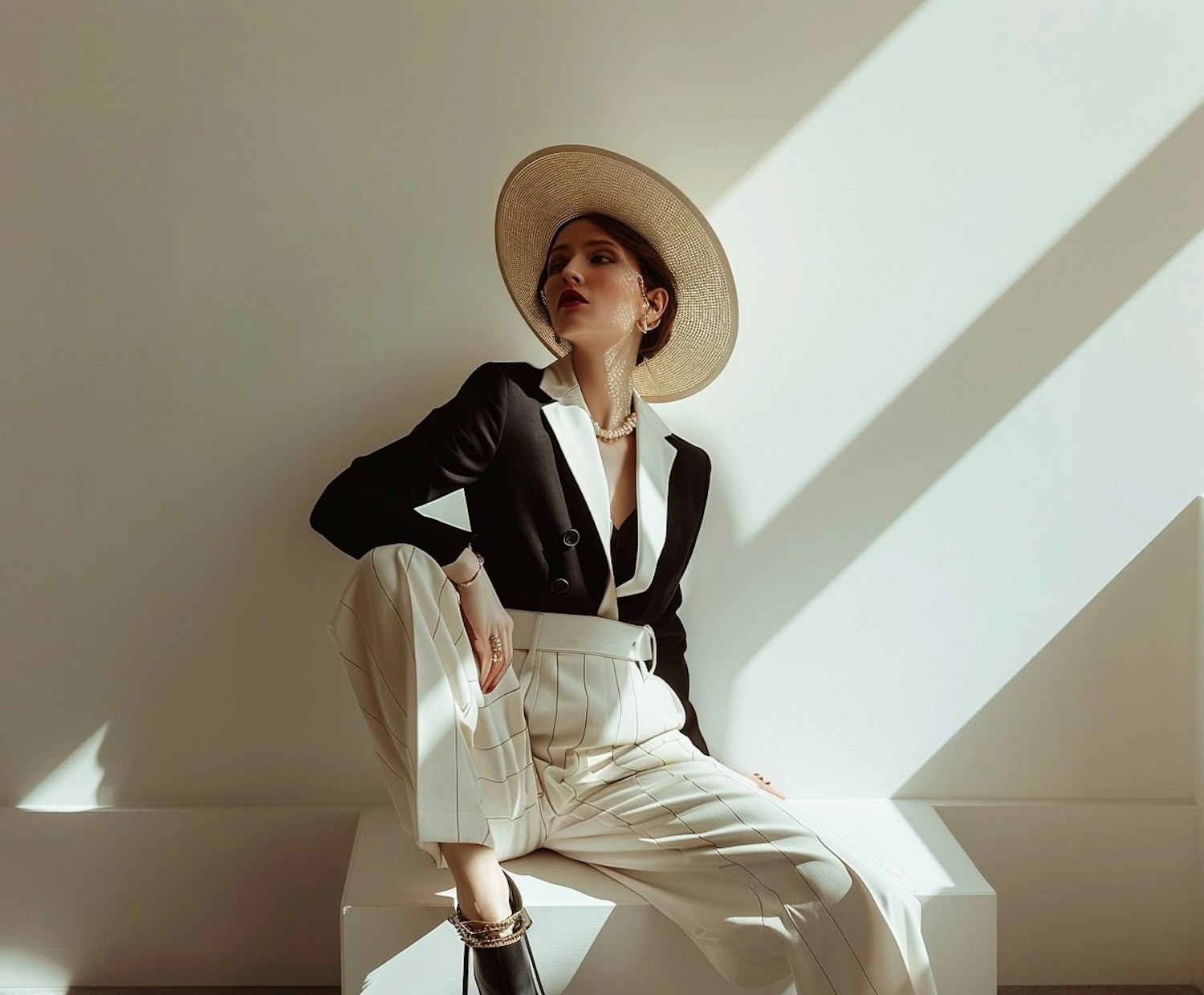 Chic woman in a black blazer and white trousers, wearing a straw hat, sits in dramatic sunlight, exuding elegance and style.