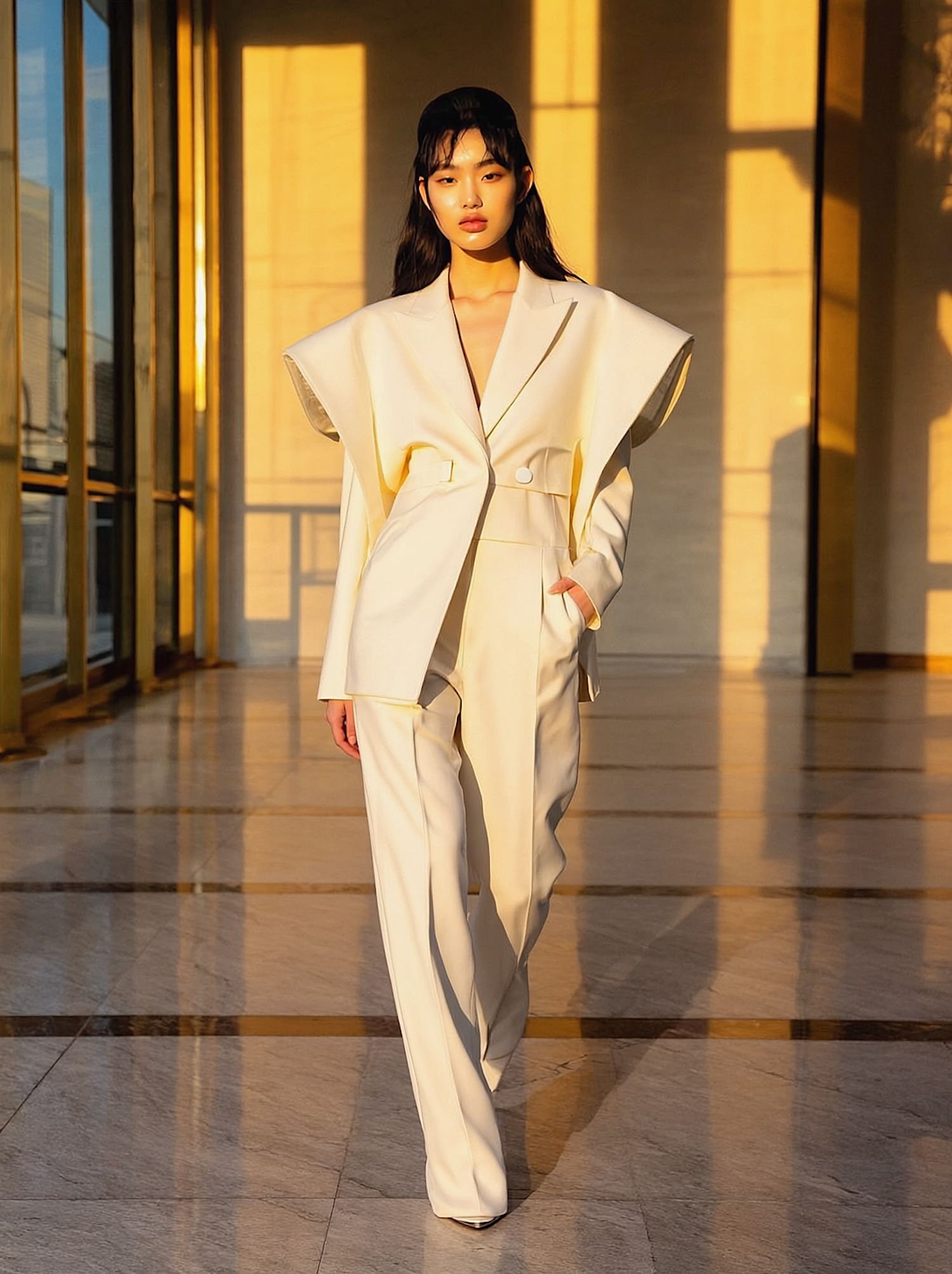 Stylish woman in a cream suit with bold shoulders walks in golden sunlight, exuding modern elegance in a minimalist setting.