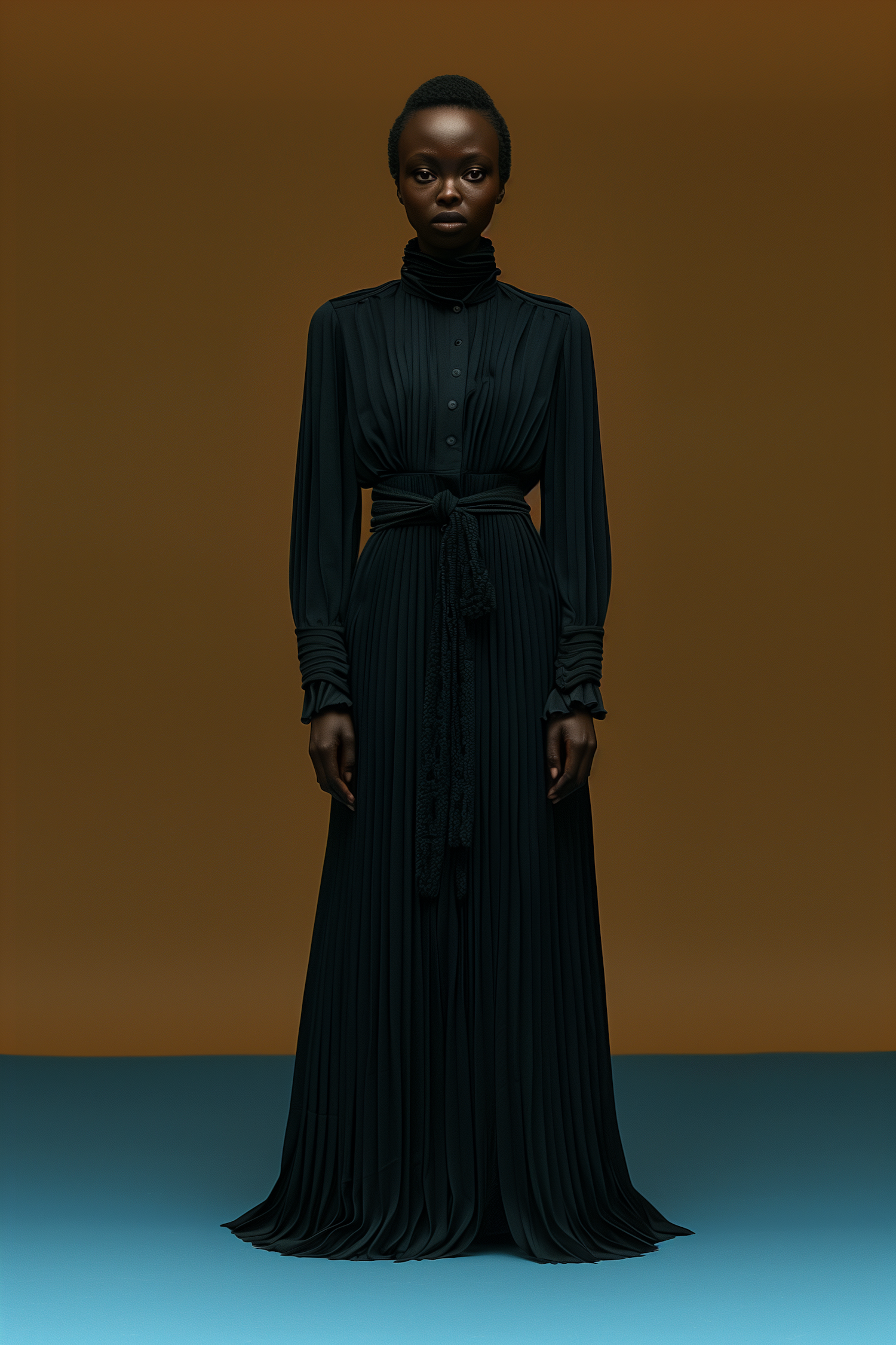 Elegant Black woman in a pleated black dress against a brown background with a blue floor, exuding confidence and grace.