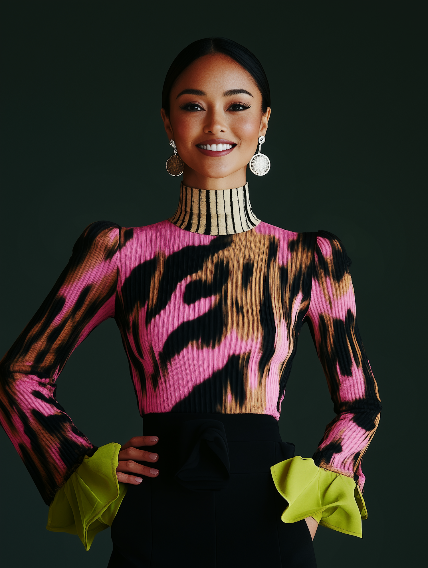 Asian woman in vibrant patterned top with yellow ruffles, silver earrings, and sleek hairstyle against a dark background.