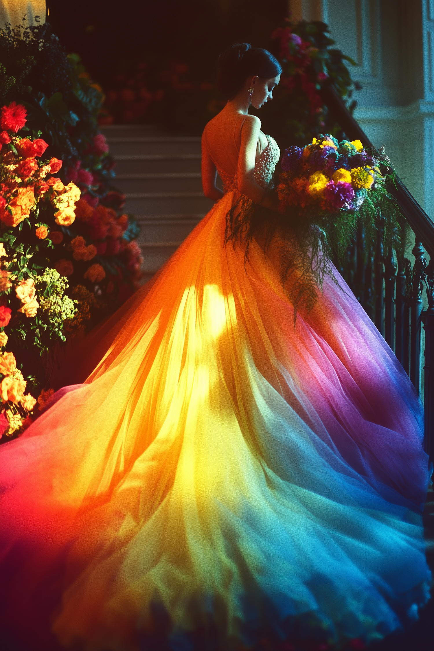 Elegant woman in a rainbow gown holding a vibrant bouquet on a floral staircase, bathed in soft light.