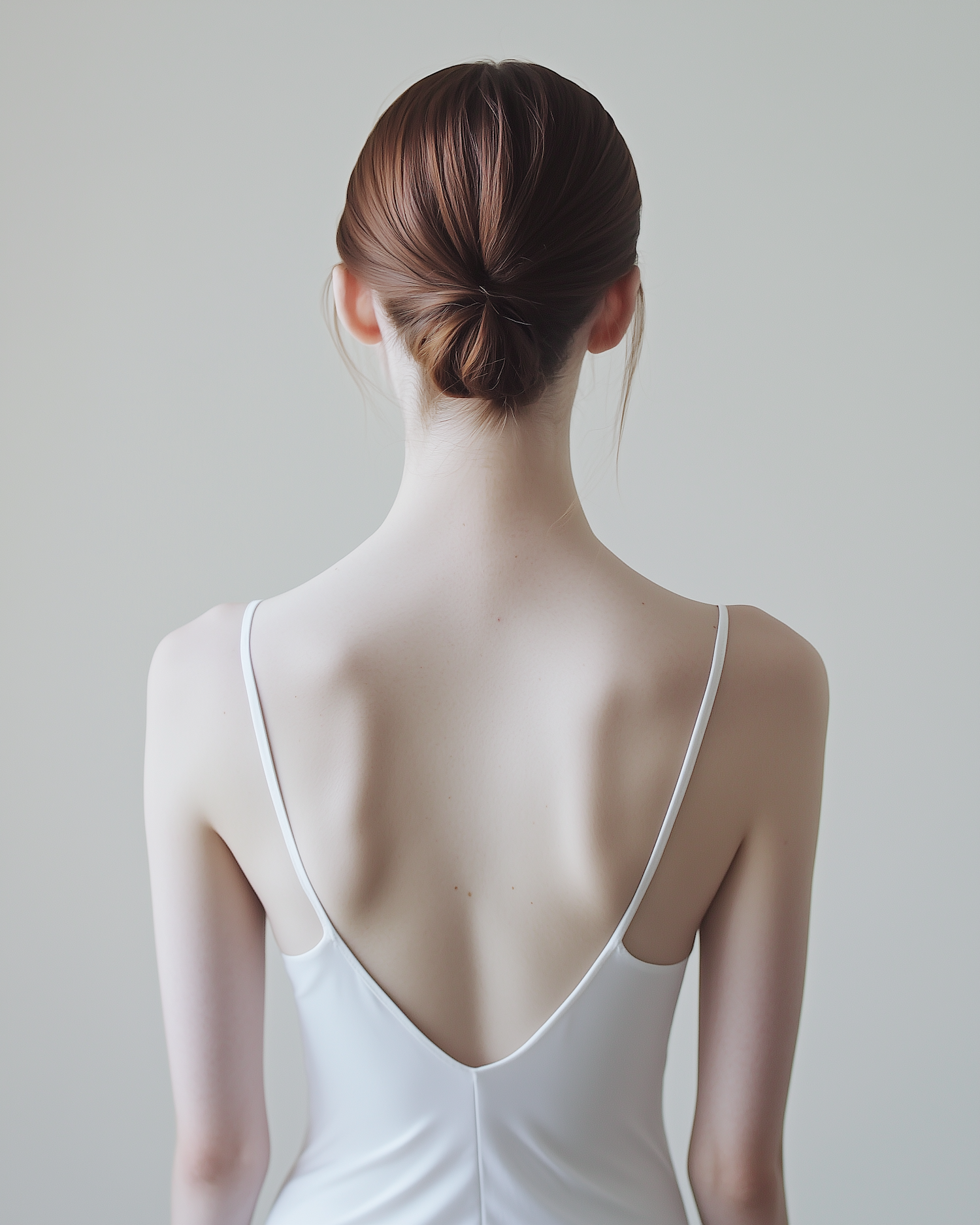 Minimalist back view of a woman with auburn hair in a low bun, wearing a white V-back dress against a neutral background.