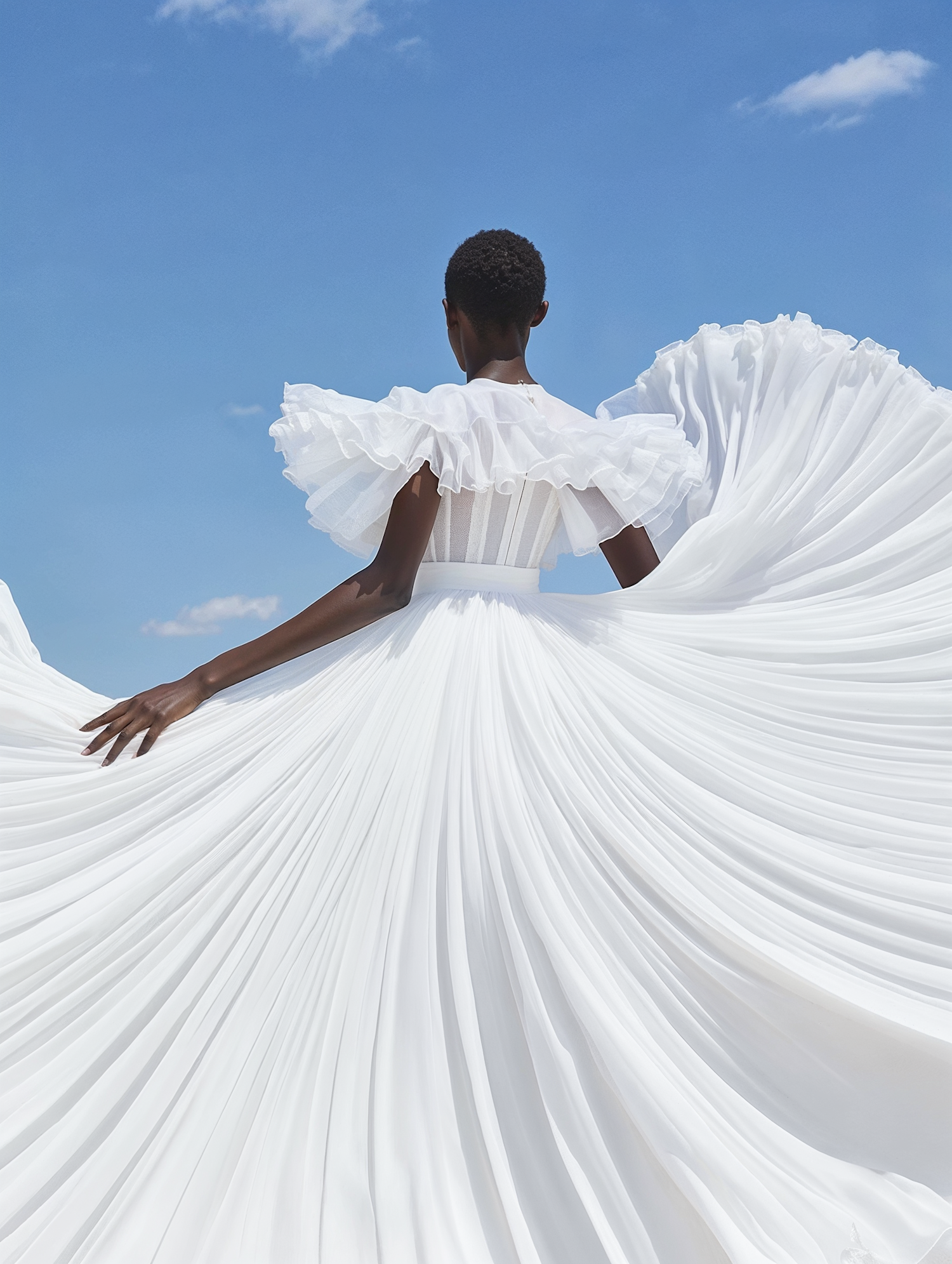 A woman in a flowing white dress with ruffled sleeves stands against a bright blue sky, creating a dreamy and elegant visual.