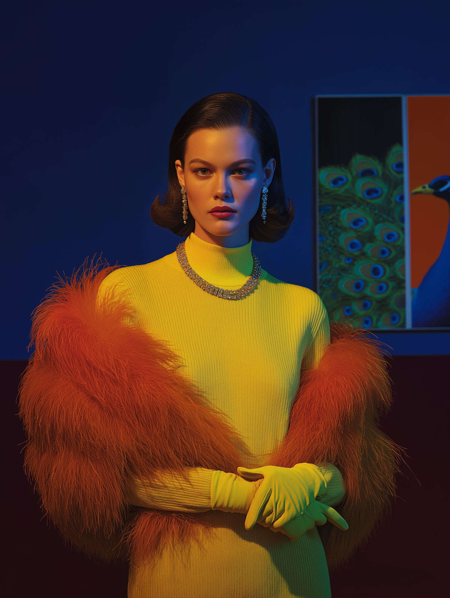 Elegant woman in a yellow outfit with orange fur stole, accessorized with jewelry, against a blue background with a peacock feather painting.