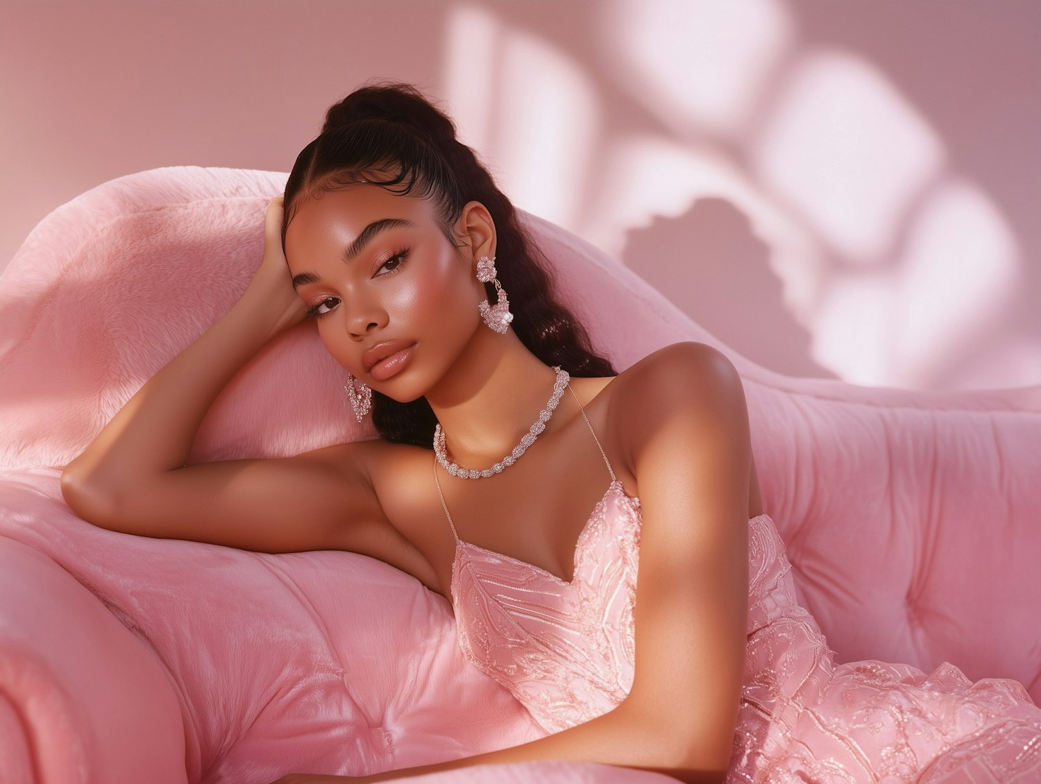 Elegant woman in a pink gown reclines on a plush sofa, adorned with sparkling jewelry and soft lighting for a dreamy ambiance.