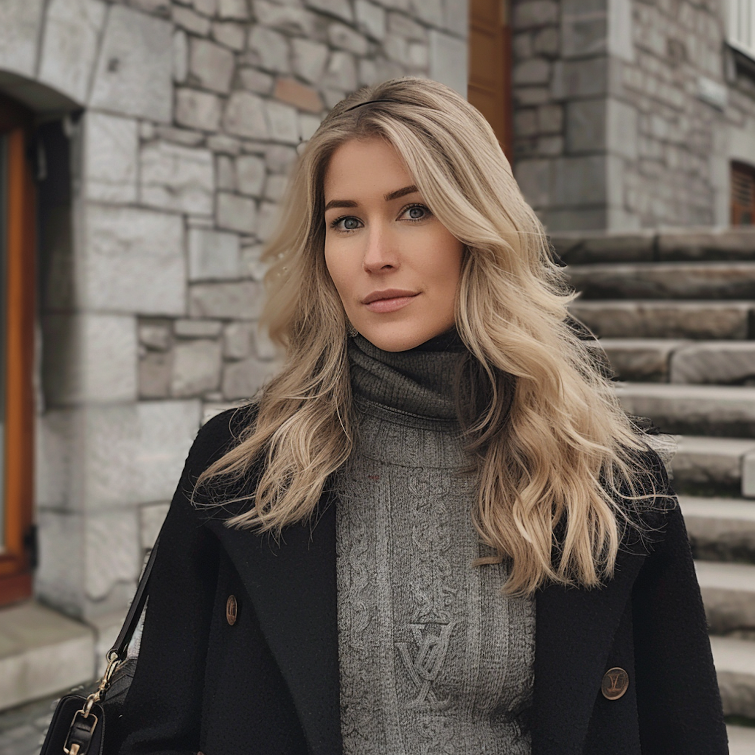 Blonde woman in a dark coat and gray sweater stands by a stone building, exuding elegance and style in an urban setting.