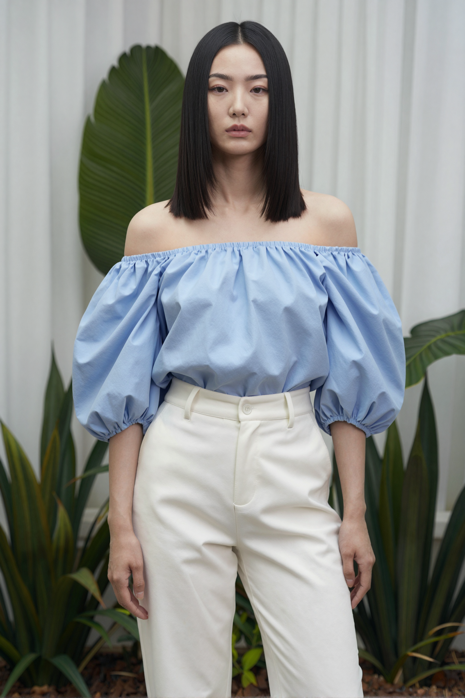 A woman in a light blue off-shoulder blouse and white trousers stands against a backdrop of green foliage and white curtains.