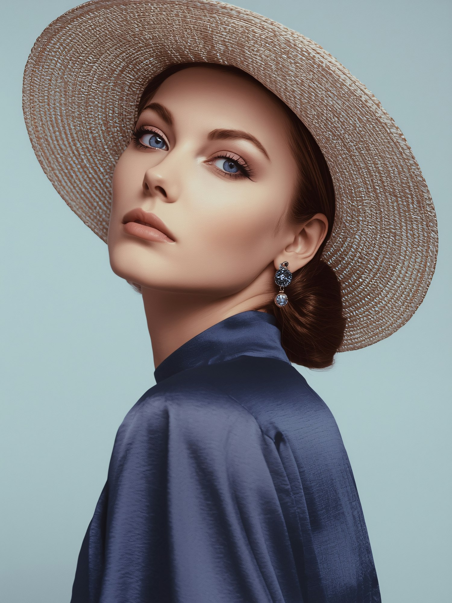 Elegant woman in a straw hat and blue blouse, accessorized with gemstone earrings, set against a soft pastel blue background.