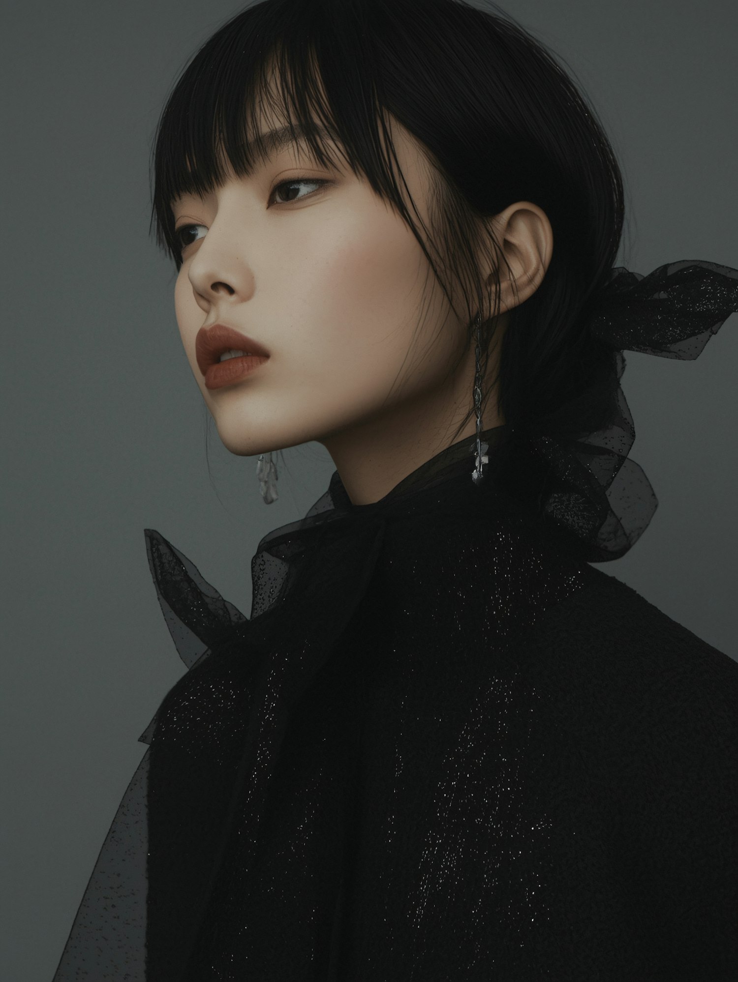 Elegant portrait of a woman in a shimmering black outfit, with sleek black hair and delicate earrings, set against a muted gray background.