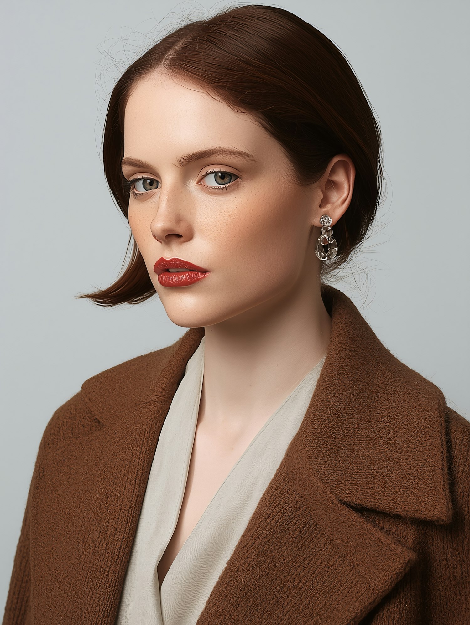 A woman in a brown coat and beige blouse, accessorized with silver earrings, poses against a neutral background.