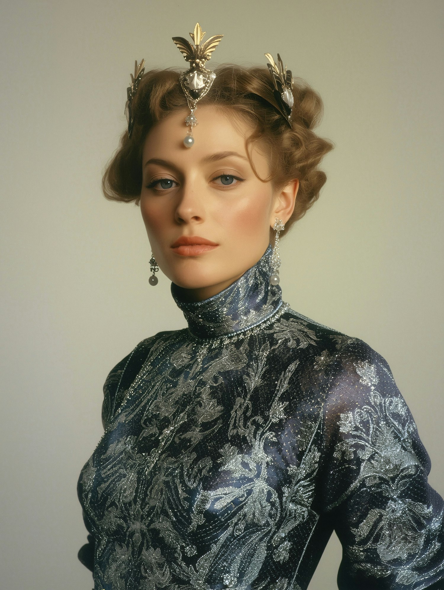 A regal woman in a shimmering silver floral dress and ornate headpiece, exuding elegance and sophistication against a neutral backdrop.