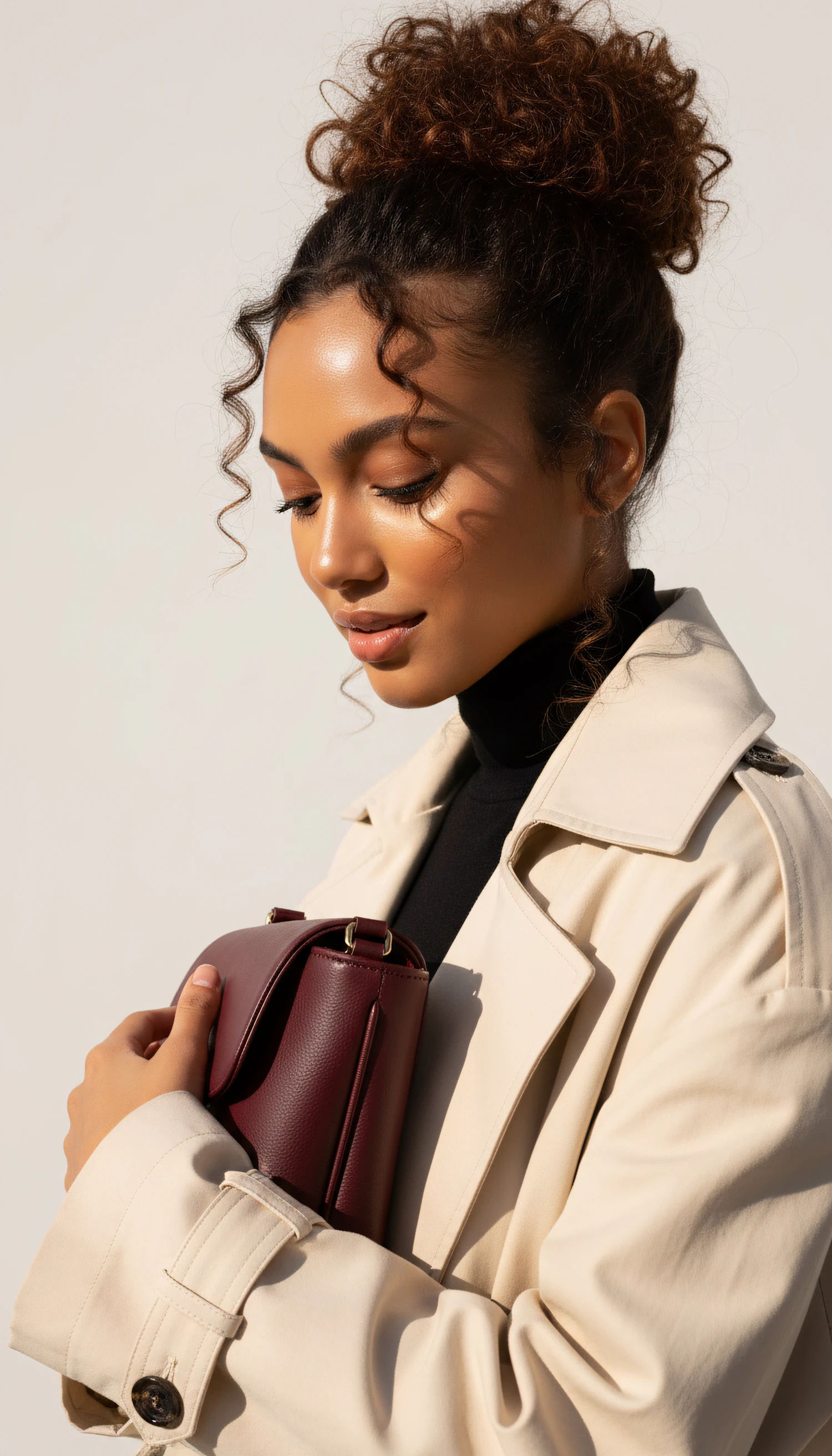 A stylish woman in a beige trench coat holds a burgundy handbag, her curly hair in a bun, against a neutral background.