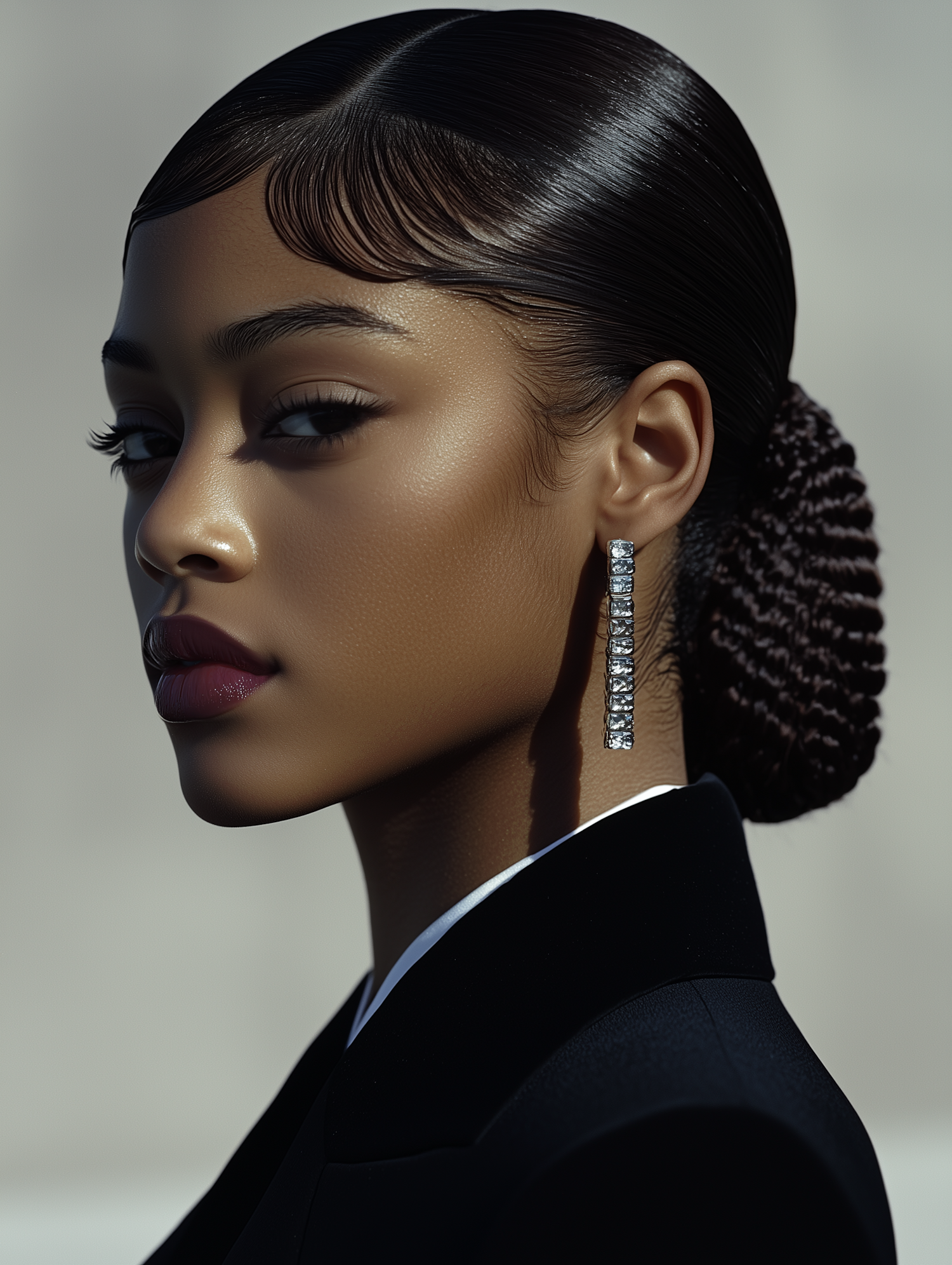 Elegant portrait of a young Black woman with sleek hair, diamond earrings, and a black blazer, exuding sophistication and confidence.