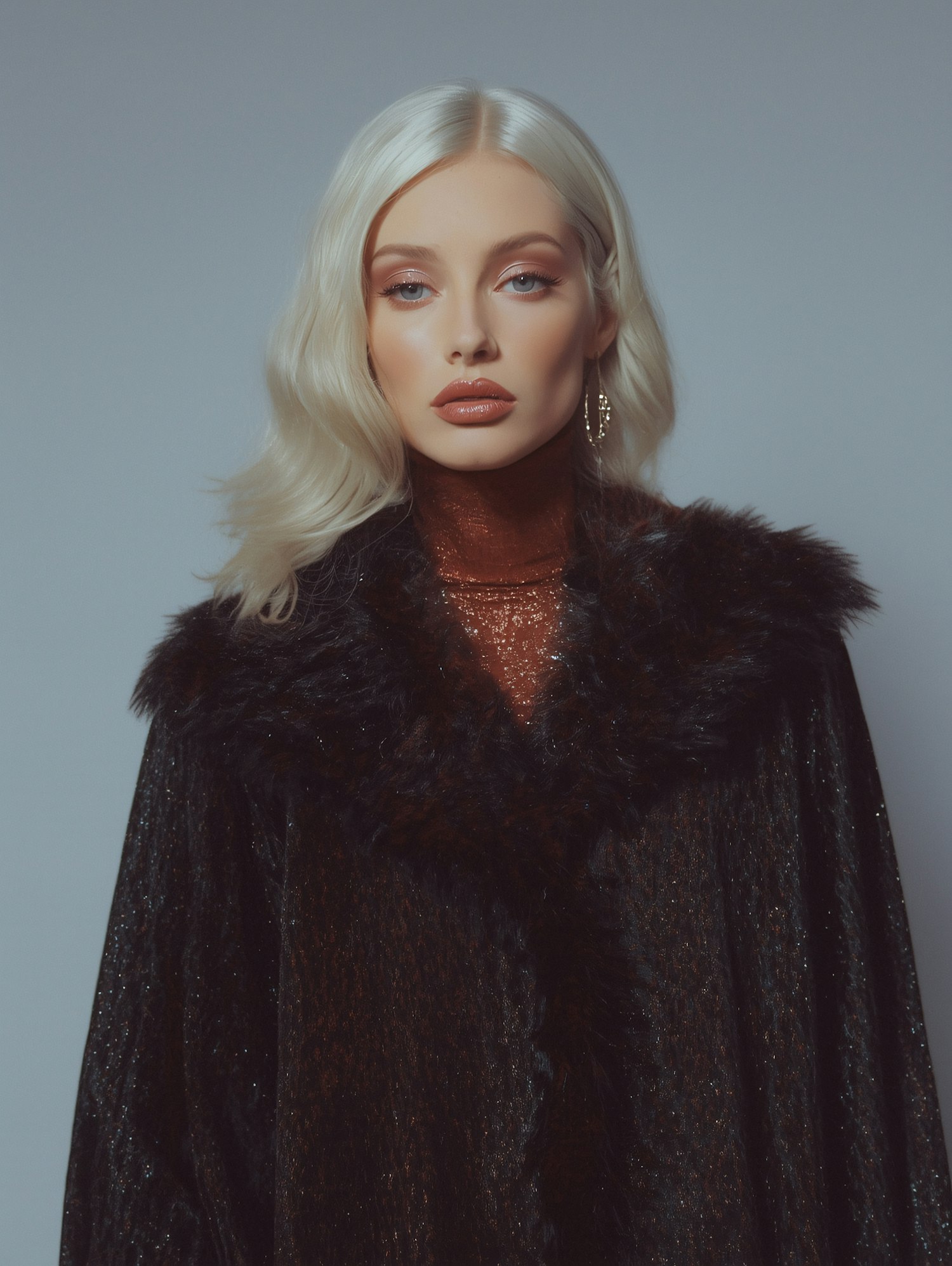 Elegant woman with platinum blonde hair in a dark fur-collared coat, posing against a neutral background.