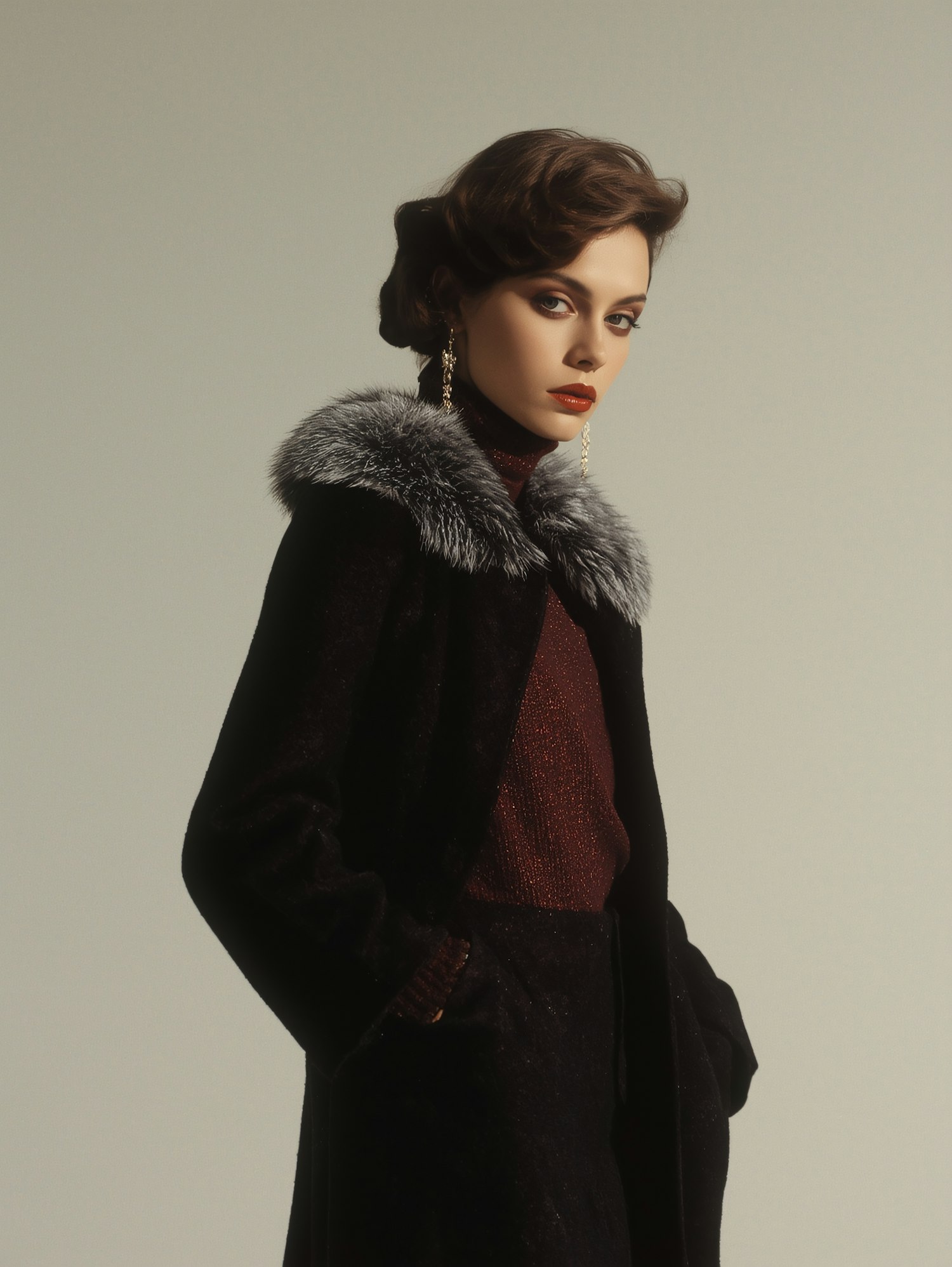 Elegant woman in a fur-collared coat and red sweater, styled with vintage-inspired hair and statement earrings, against a neutral backdrop.