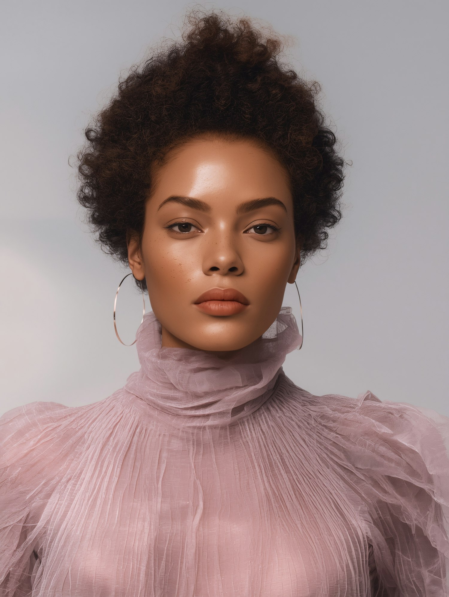 Elegant portrait of a woman in a sheer pink blouse with a high neck, styled hair, and hoop earrings, set against a soft gradient background.