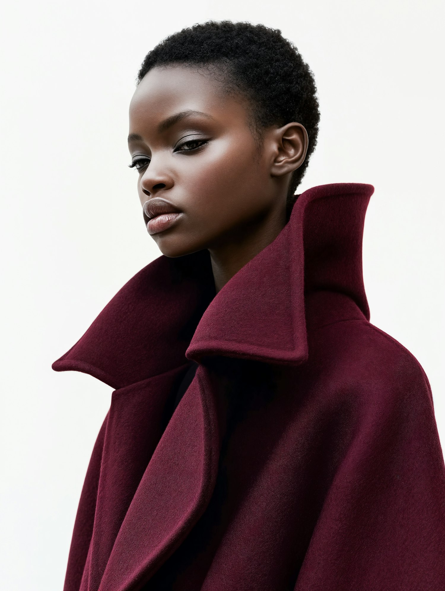 Elegant portrait of a woman in a burgundy coat with a dramatic collar, showcasing confidence and minimalist sophistication.