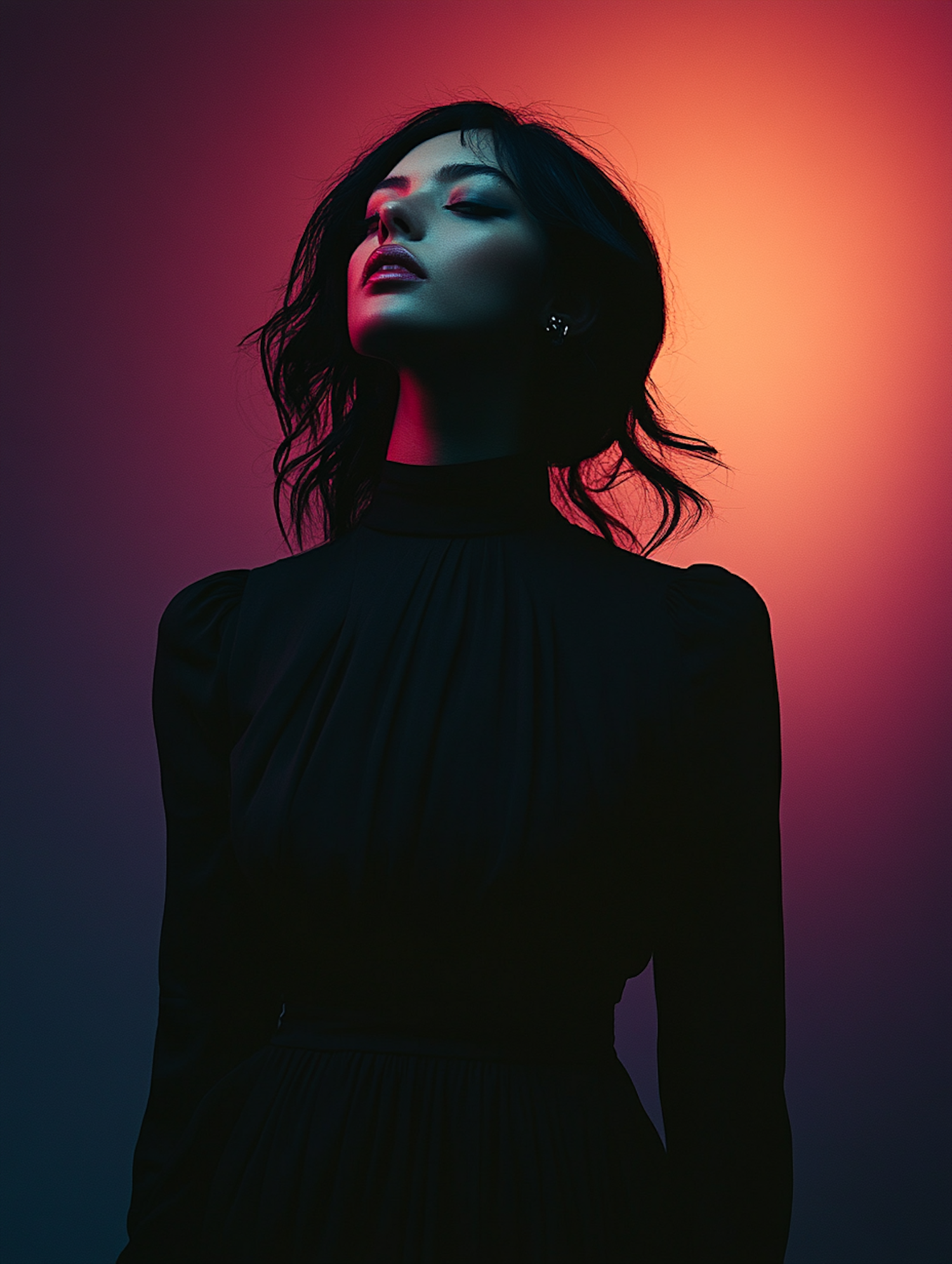A dramatic portrait of a woman in a black dress, illuminated by vibrant red and purple lighting, creating a moody and artistic vibe.