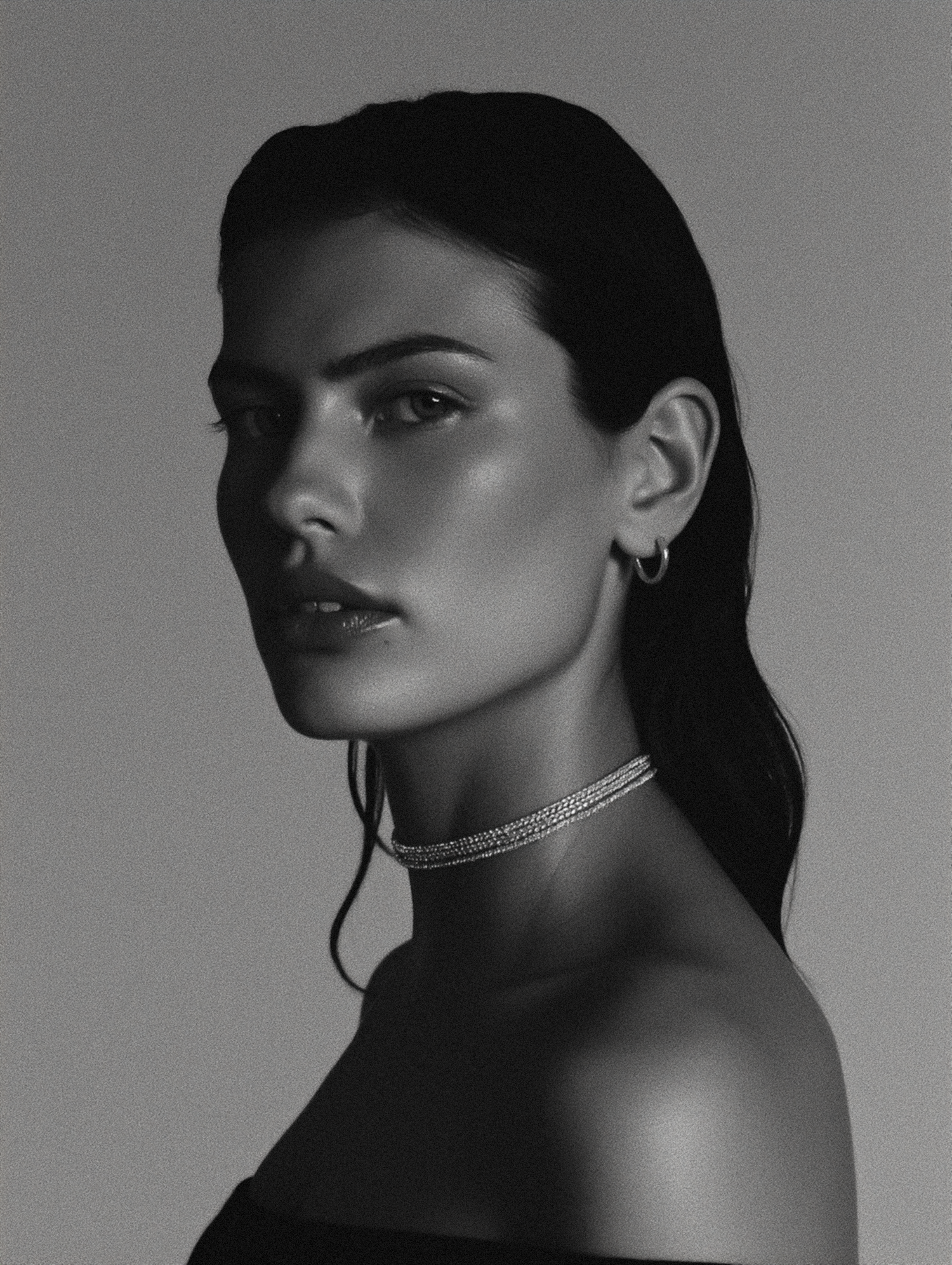 Black-and-white portrait of a woman with sleek hair, a layered choker, and hoop earrings, exuding elegance in dramatic lighting.