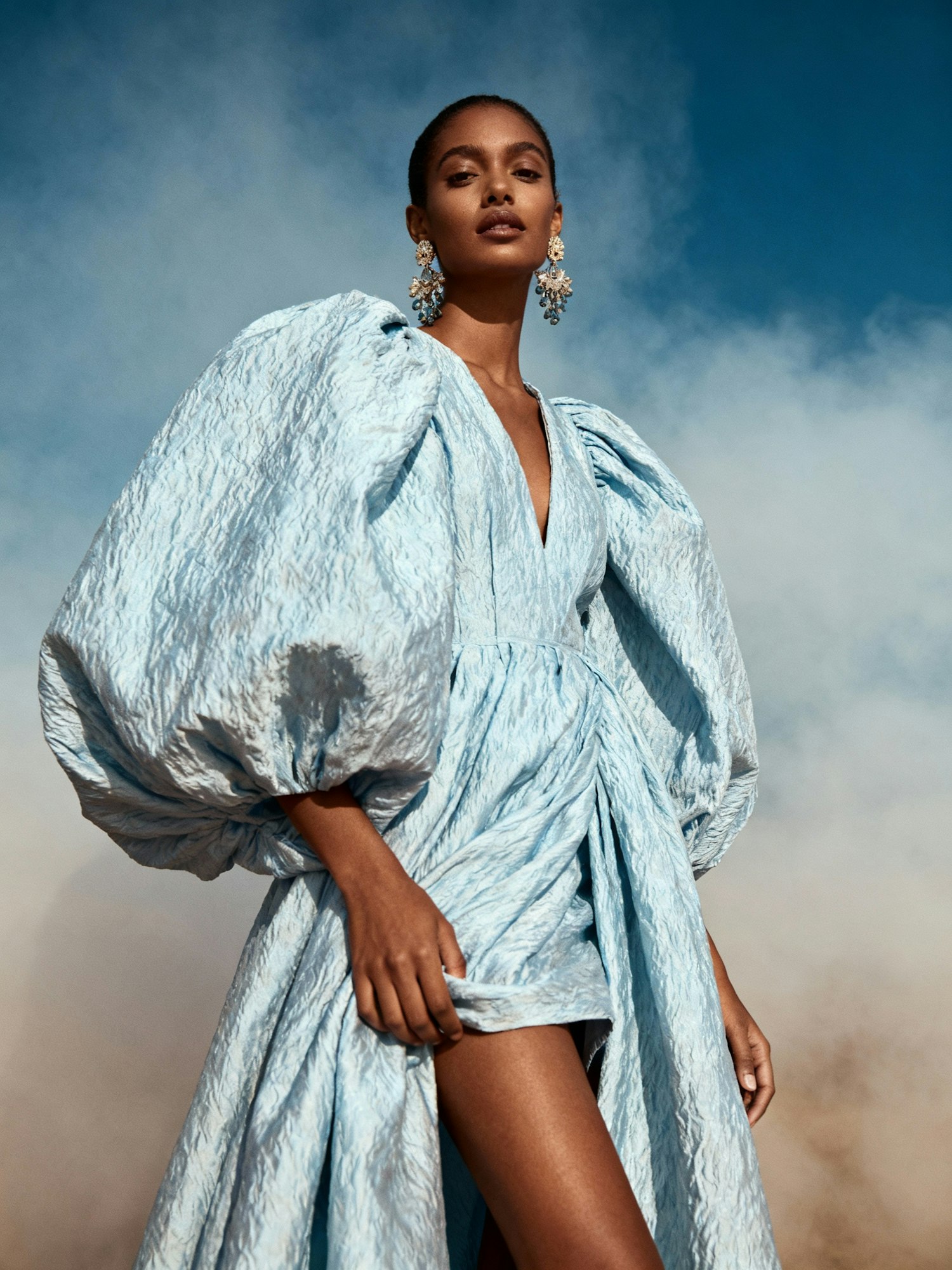 A woman in a textured blue dress with puffed sleeves and ornate earrings stands against a clear sky, exuding elegance and style.
