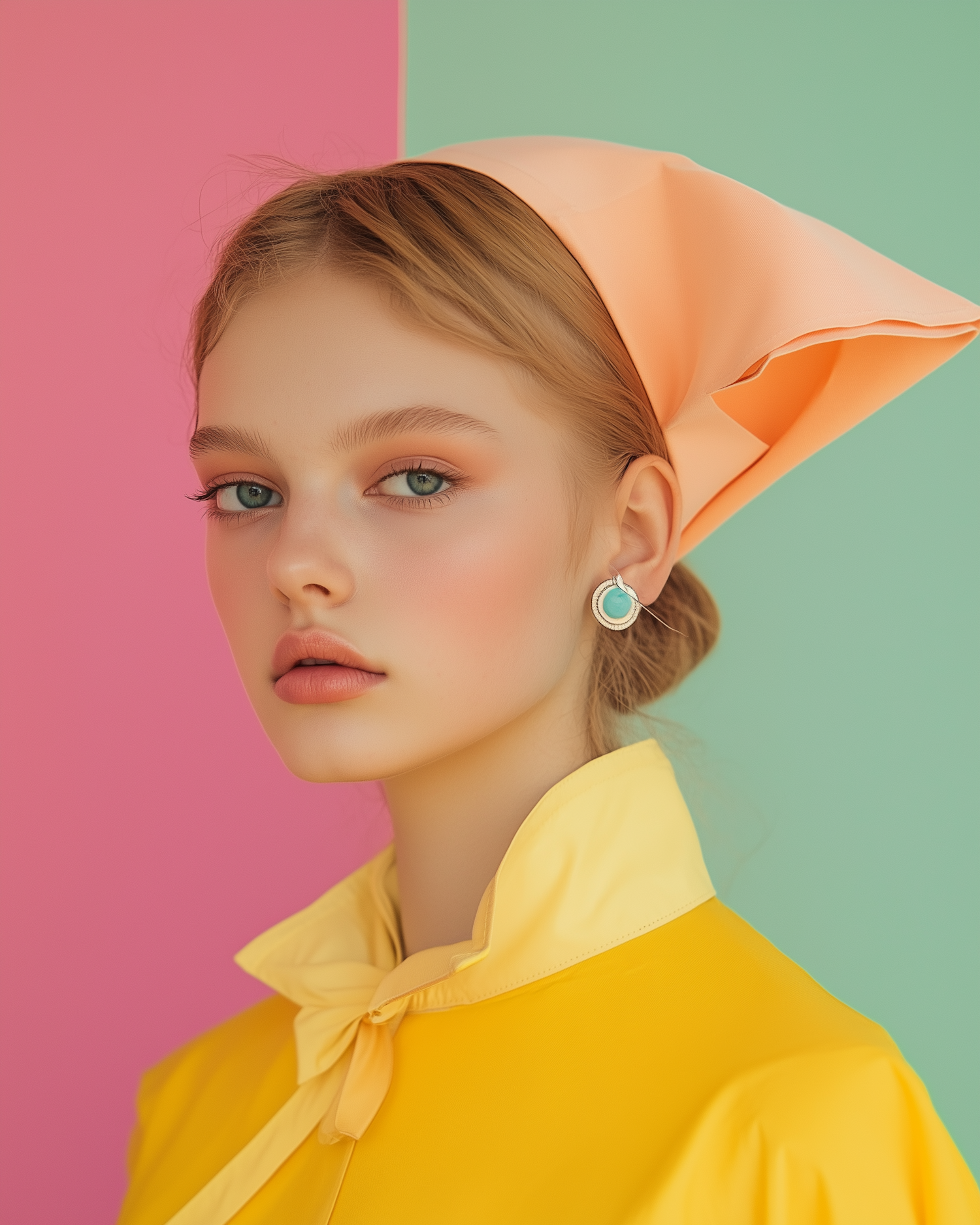 Elegant portrait of a woman in a yellow blouse and peach headscarf, set against a pastel pink and green background.