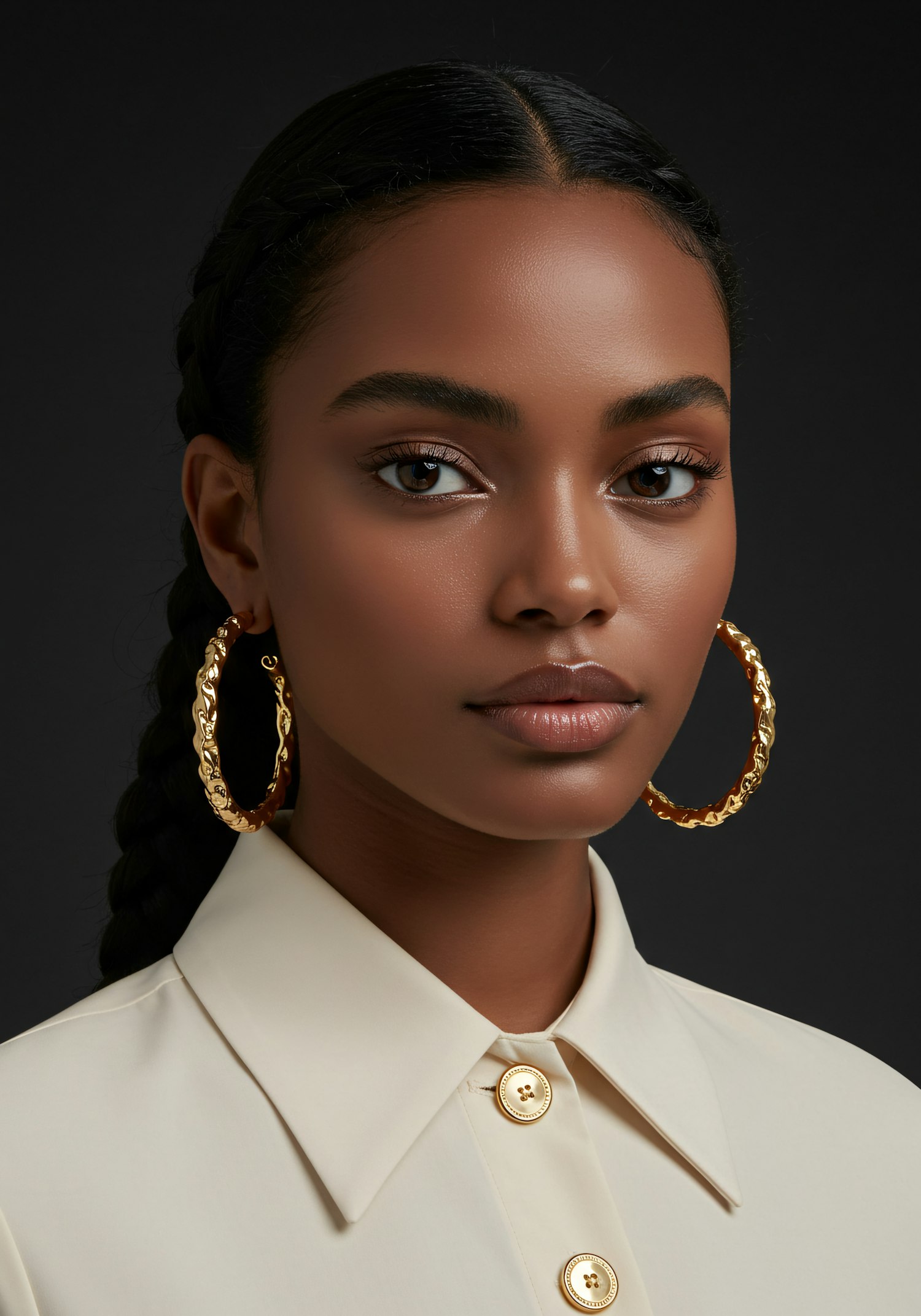 Elegant woman in gold hoop earrings and a cream shirt with gold buttons, against a simple dark background.