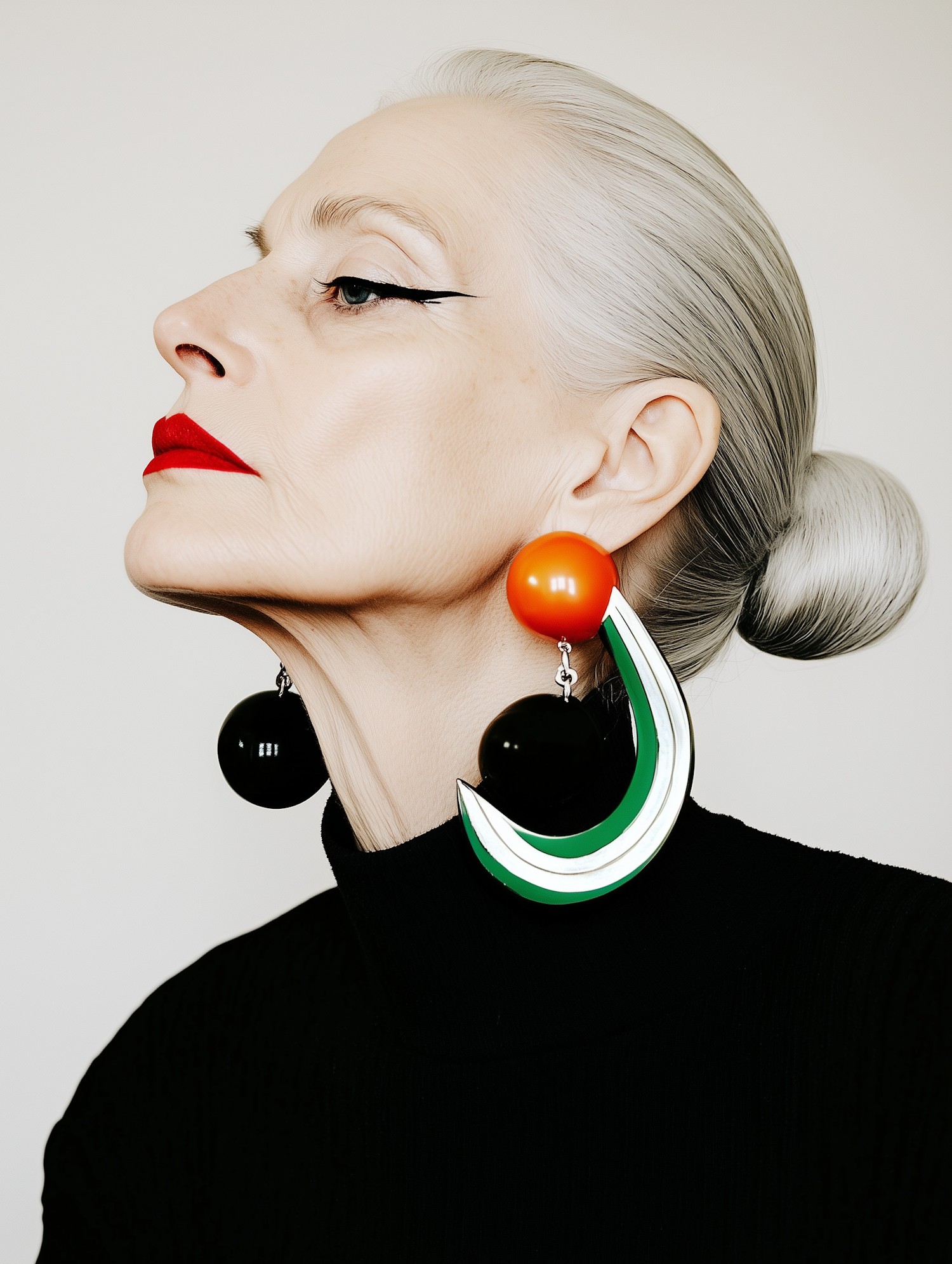 Elegant older woman with silver hair, bold earrings, sharp eyeliner, and red lipstick in a sleek black turtleneck against a neutral background.
