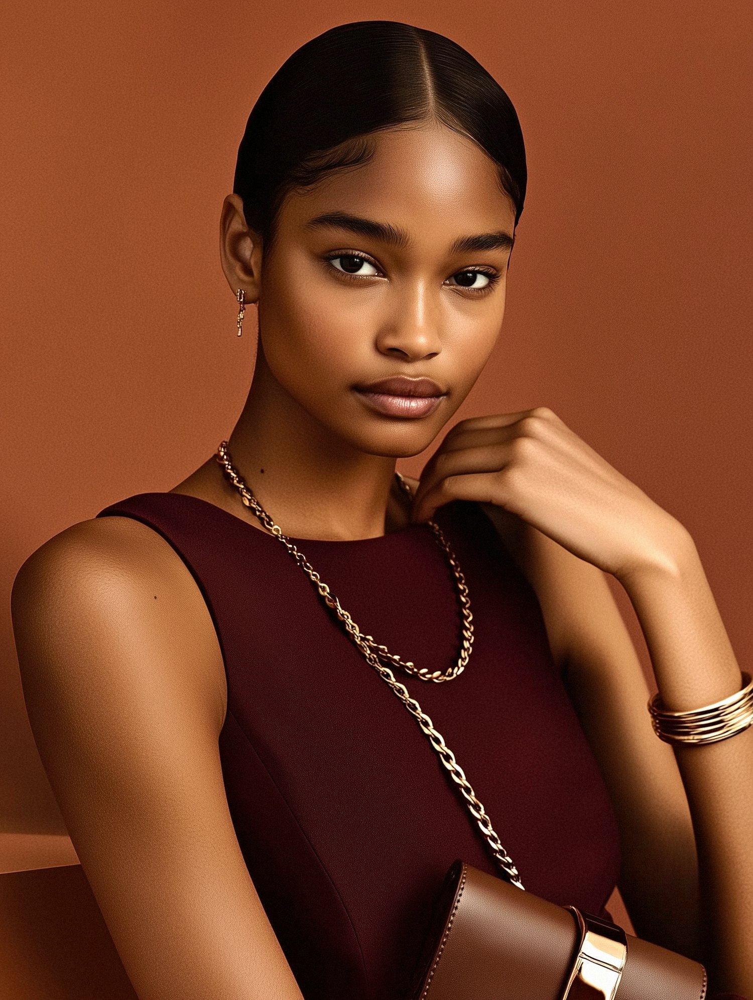 Elegant portrait of a woman in a burgundy dress, accessorized with gold jewelry and a brown handbag, set against a warm brown background.
