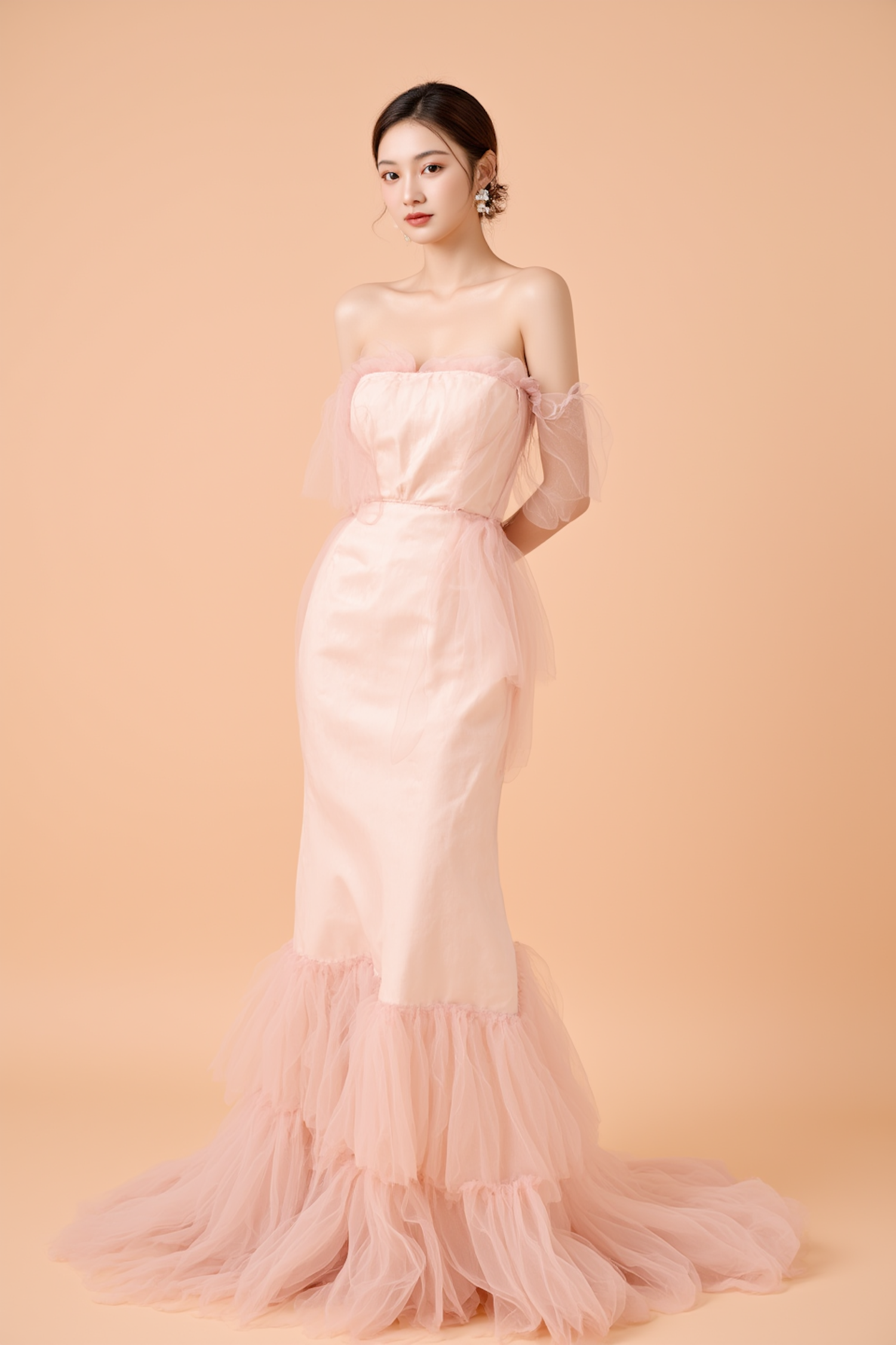 Elegant woman in a pale pink strapless gown with tulle accents, posing gracefully against a peach background. Perfect for bridal or fashion themes.