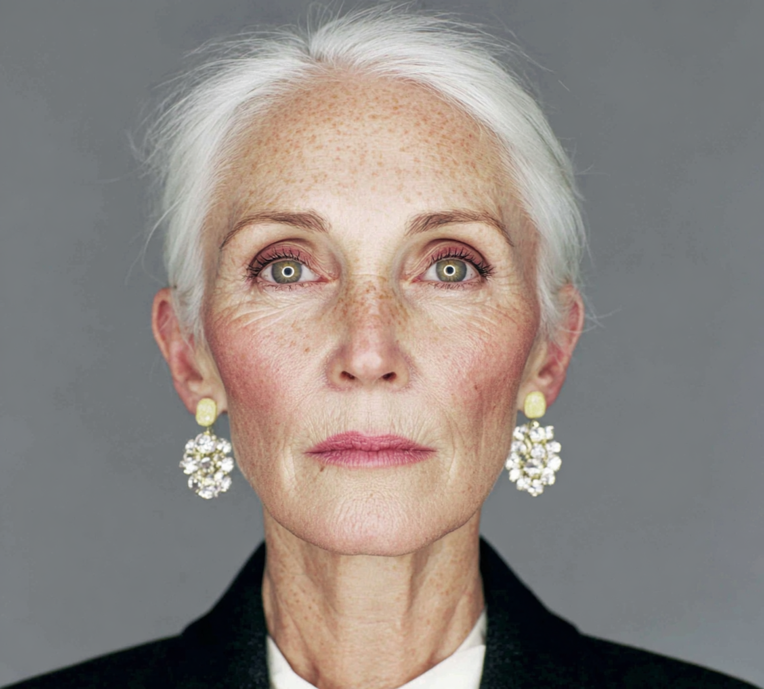A striking portrait of an older woman with white hair, green eyes, and elegant earrings, set against a neutral gray background.
