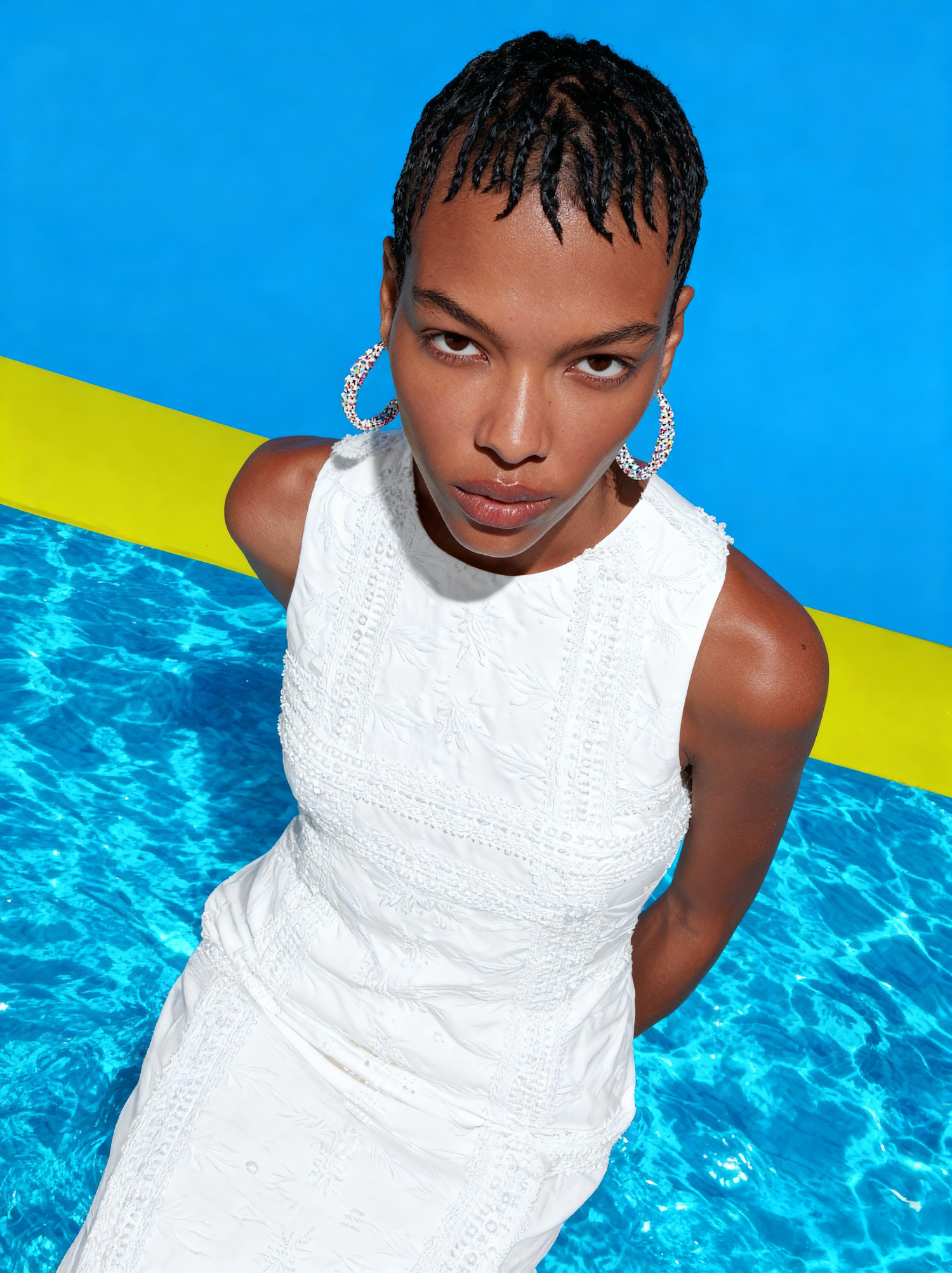 A stylish woman in a white dress poses against a vibrant blue and yellow background, accessorized with sparkling hoop earrings.