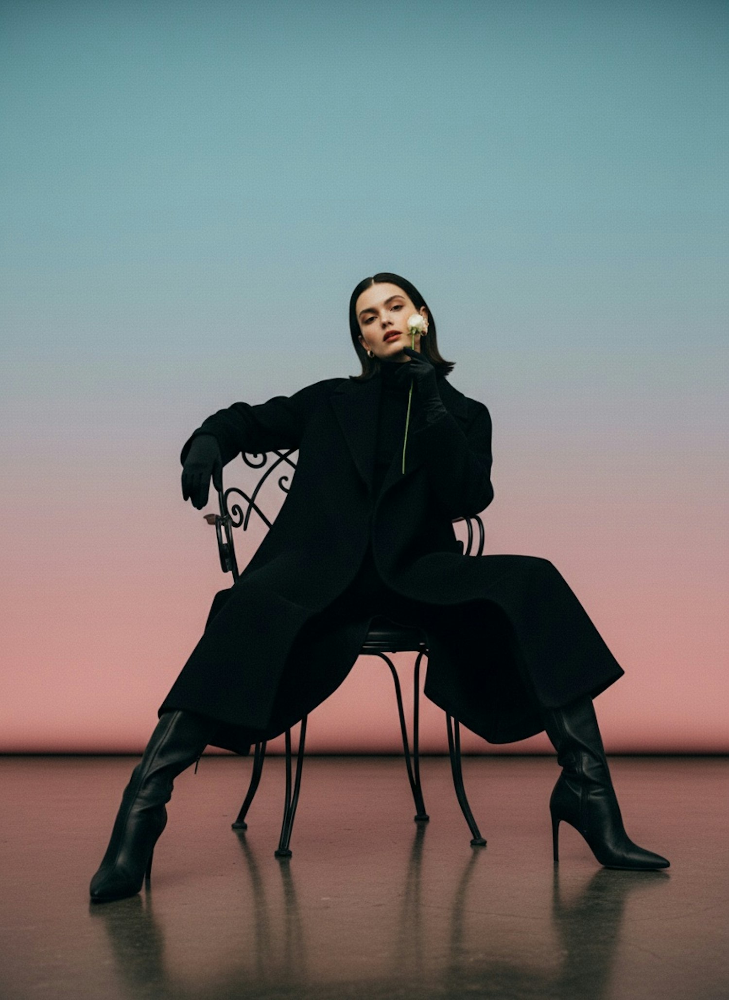 A stylish woman in black attire sits on a chair with a gradient background, holding a white flower, creating a minimalistic yet striking scene.