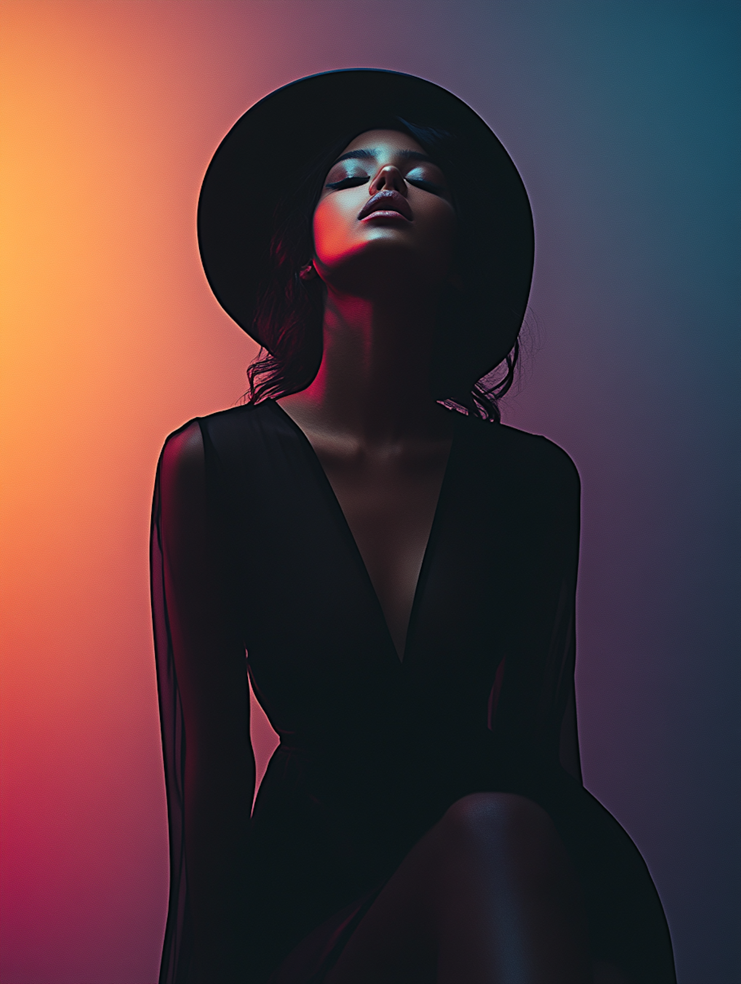 Stylized portrait of a woman in a black hat and dress, set against a gradient background with dramatic lighting and vibrant tones.