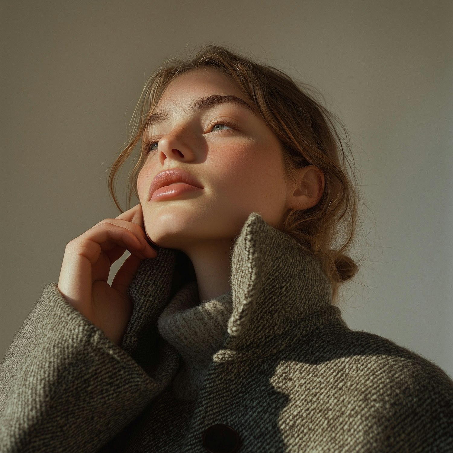 A serene portrait of a woman in soft light, wearing a textured gray coat and turtleneck, with a contemplative upward gaze.