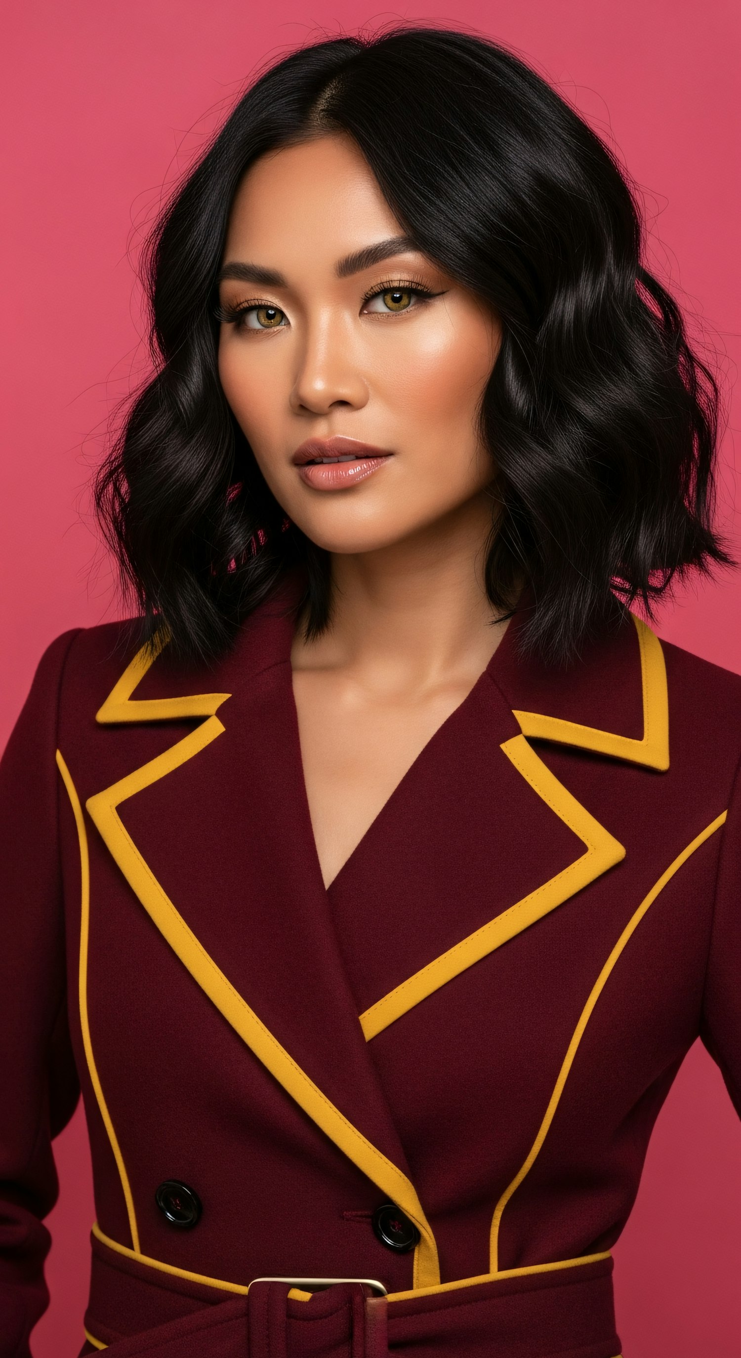 Stylish portrait of a woman wearing a burgundy and yellow blazer, paired with a sleek hairstyle. Shot against a vibrant pink backdrop.