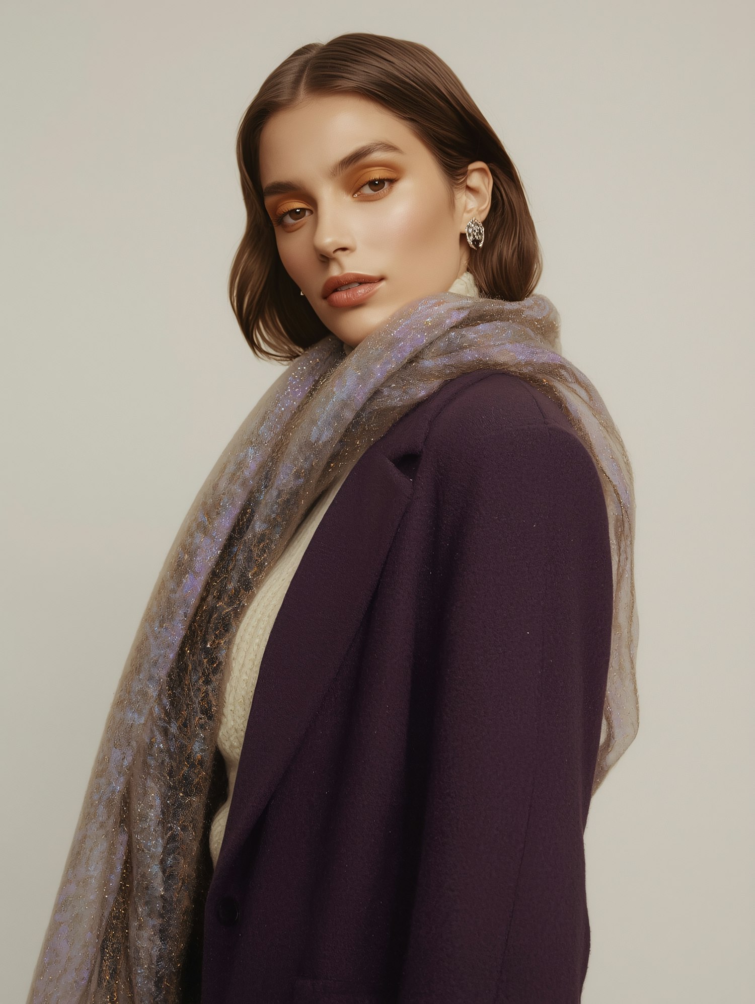 Stylish woman in a purple coat and shimmering scarf, with warm-toned makeup and silver earrings, posing against a neutral background.