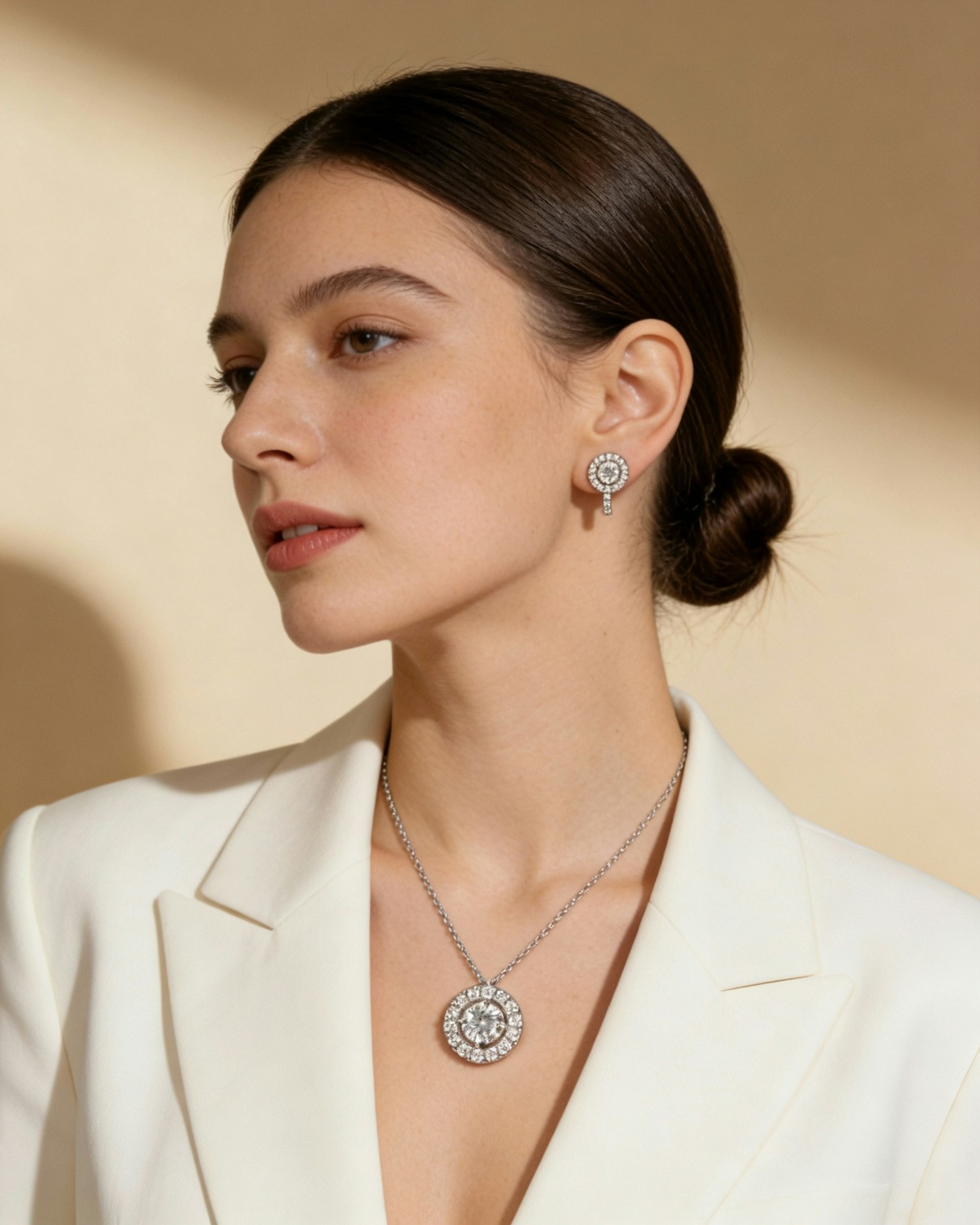 A woman in a white blazer wearing diamond earrings and a matching necklace with a round pendant, set against a warm beige background.
