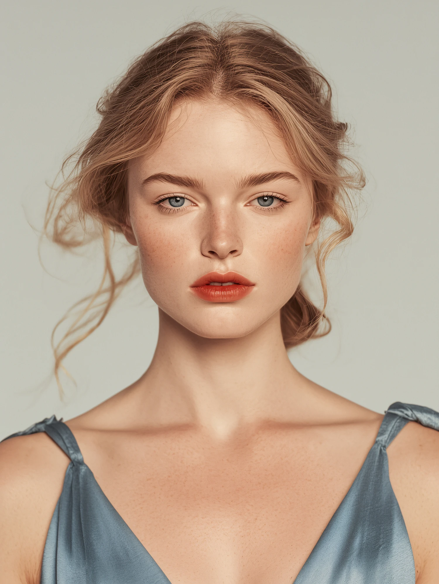 Elegant portrait of a blonde woman in a blue satin dress, with red lipstick and a soft, neutral background.