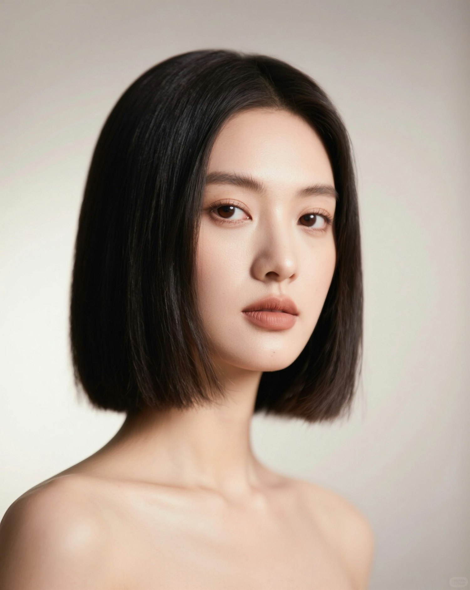Portrait of a woman with sleek black bob haircut, minimal makeup, and a neutral background, showcasing natural beauty and elegance.