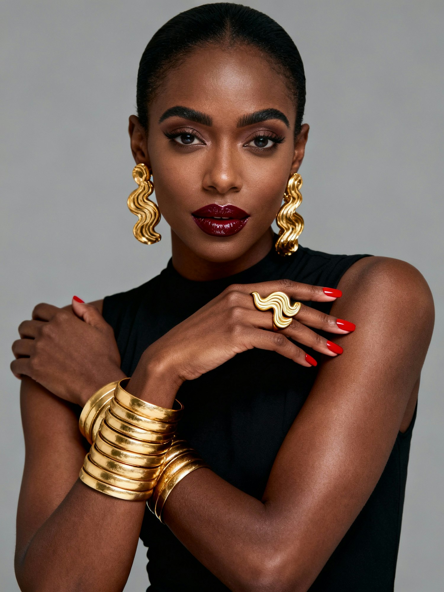 Waist-up, high-definition portrait of a Black woman wearing a black sleeveless top. She is adorned with large ornate gold earrings, a bold wave-shaped ring, and multiple thick gold bangles. Her hair is neatly pulled back, and her makeup includes glossy dark red lipstick and well-defined brows. Her nails are painted bright red. Her expression is confident and composed. The neutral gray background enhances the gold tones of her accessories and the richness of her skin, making the layered textures stand out. Lighting is soft and directional, casting gentle highlights across her face and jewelry. The mood is glamorous, sculptural, and editorial—ideal for an Afro-fusion fashion portrait or jewelry-focused identity showcase.
