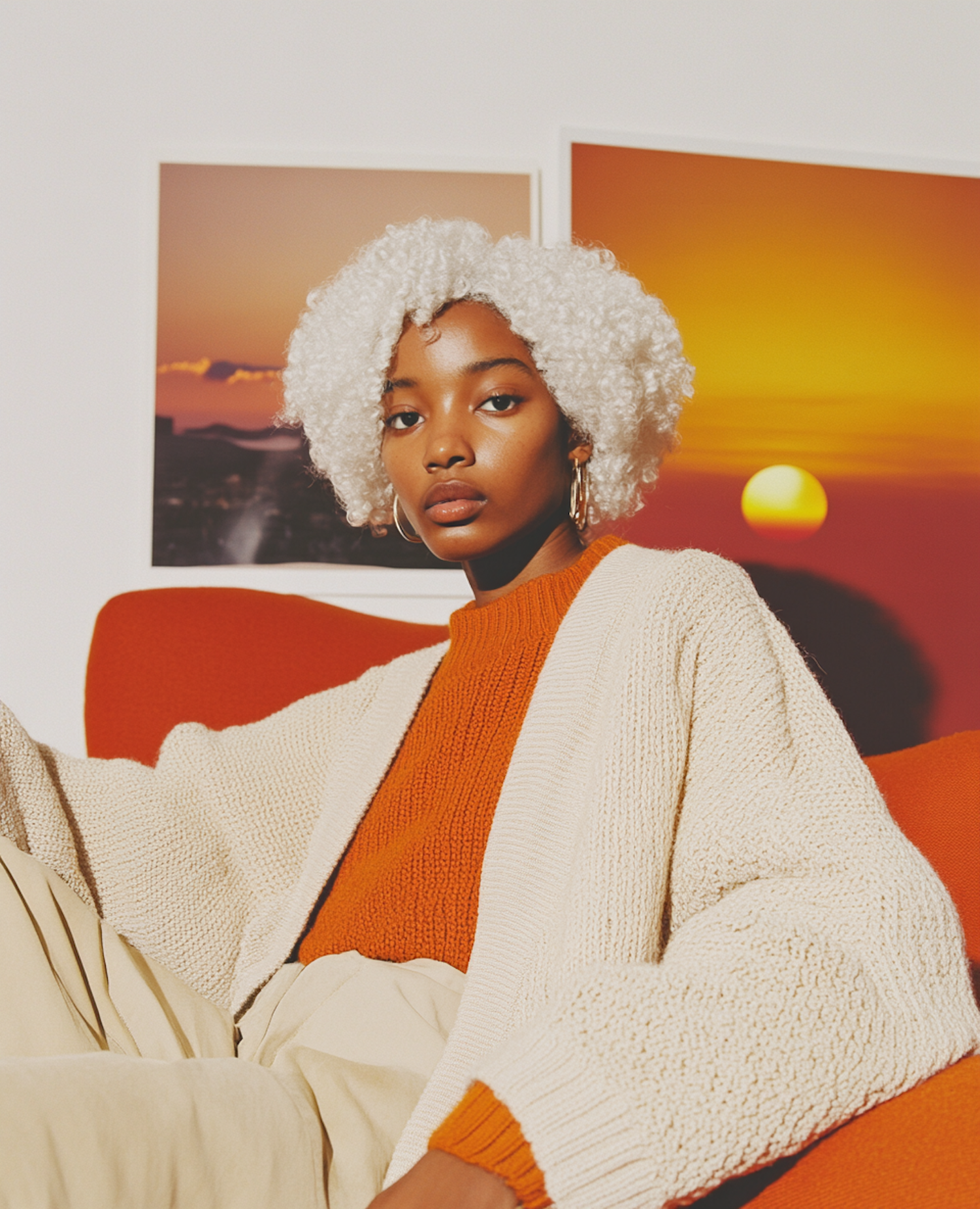 Stylish woman with white curly hair in a cream cardigan and orange sweater, sitting against a backdrop of sunset-themed art.