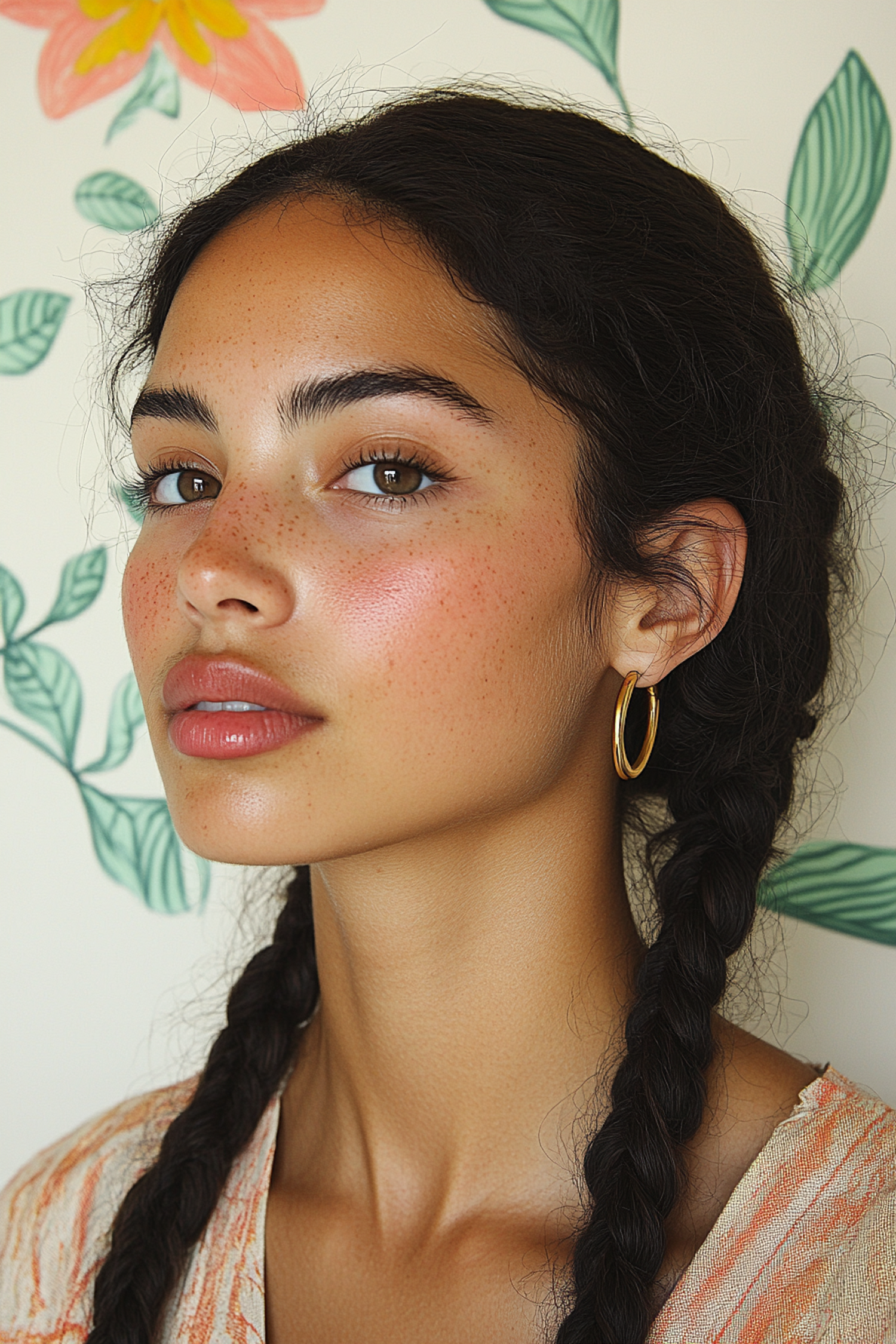 A young woman with natural freckles, braided hair, and gold hoop earrings against a floral background. Soft, natural beauty shines through.