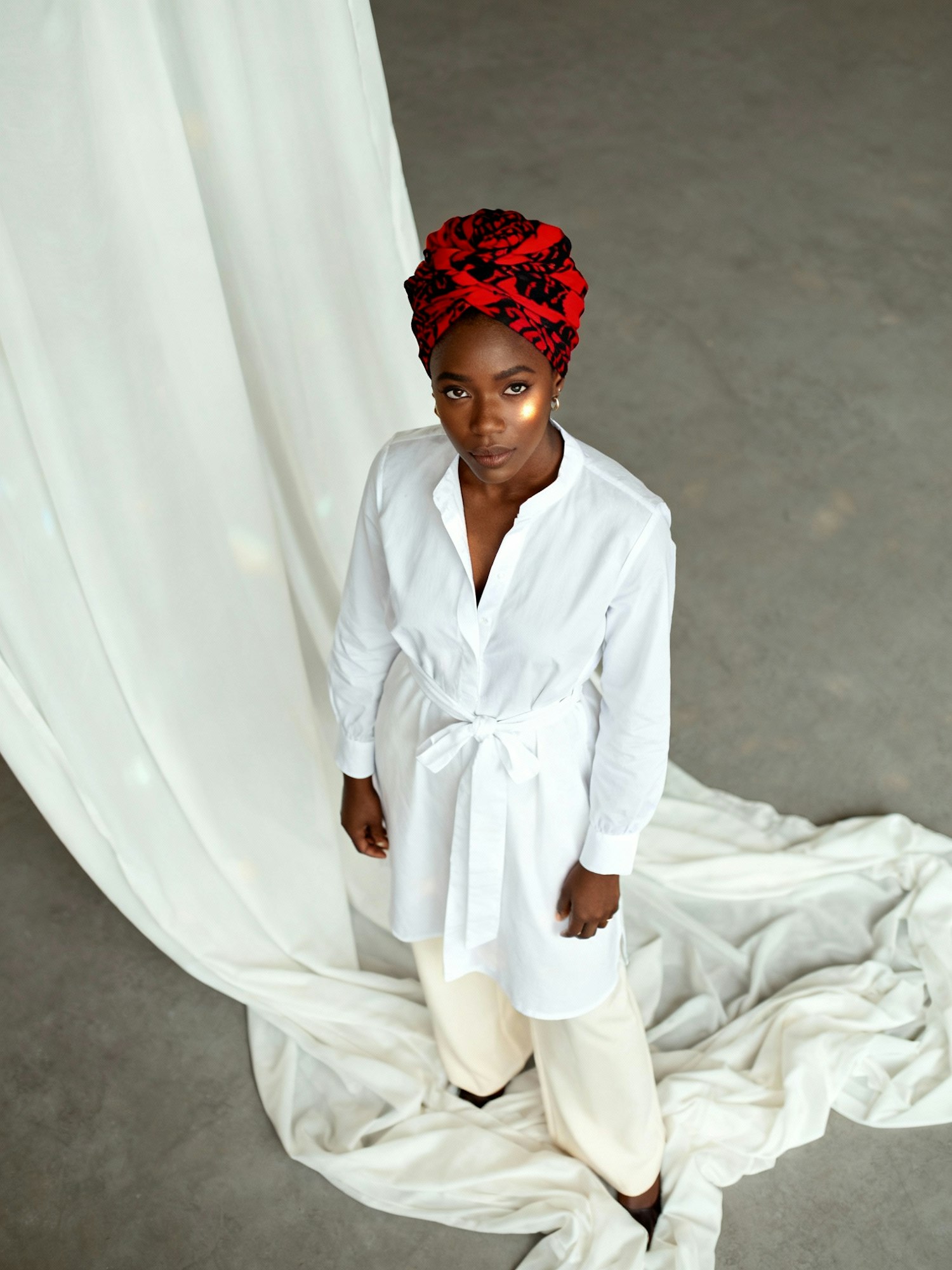 A woman in a white tunic and red headwrap stands against a minimalist backdrop with soft drapery, exuding elegance and simplicity.